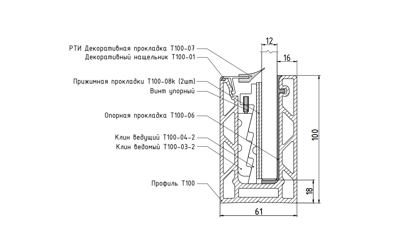 Конструкция данных зажимных систем существенно отличается от существующих на рынке. Основным техническим решением в данных системах — стало увеличение высоты прижимного клина. В аналогичных профилях, что уже существуют на рынке, высота прижимного клина 50-55мм, тогда как в профиле т100 — 80 мм. Крепежные отверстия гарантирует более удобную и быструю установку профиля на объекте, это уменьшает время и затраты на монтаж.