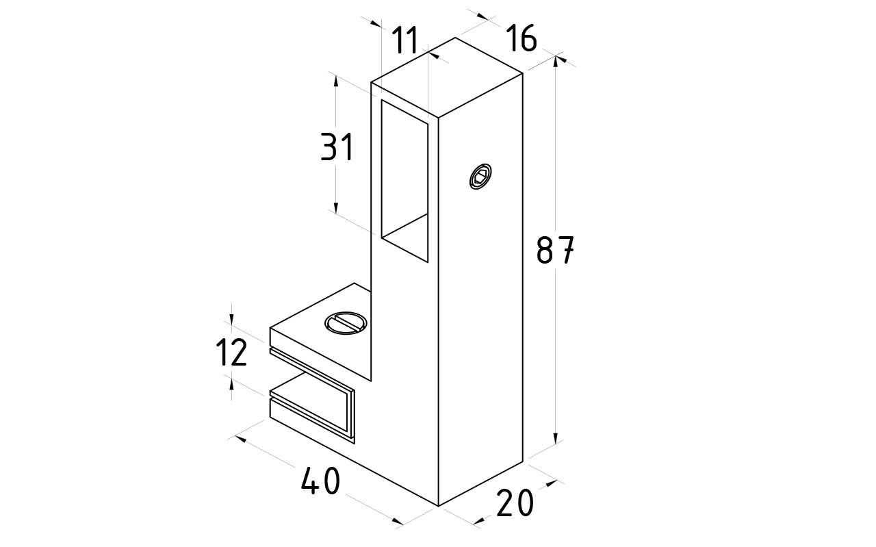 Коннектор предназначен для крепления профильной трубы 30х10 мм к стеклу в горизонтальной ориентации параллельно стеклу, при монтаже штанг верхней обвязки душевых кабин.