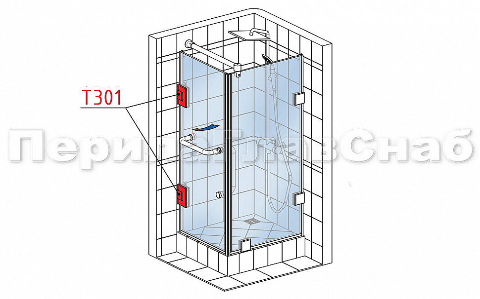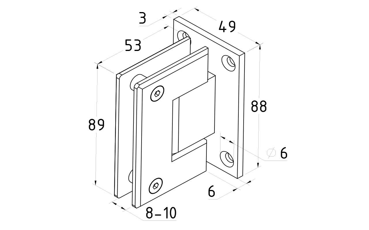 Петля из латуни с полированной поверхностью из хрома предназначена для стыковки между собой конструкционных элементов из стекла, толщина которых находится в диапазоне от 8 до 10 мм. Максимальный вес двери на 2 петли составляет 45 кг. В конструкции заложена система скрытого крепежа. Имеет функцию доводчика до закрытия от 25° градусов. Максимальный угол разведения стыковочных элементов в плане составляет 90° градусов.