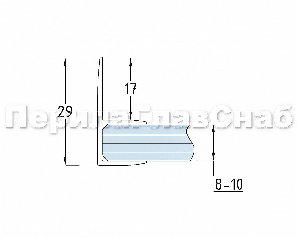 Уплотнитель имеет исполнение прозрачной поверхности, выполнен из материала ПВХ. Имеет F-образный профиль. Толщина одного типоразмера составляет 1.5 мм, длина – 2200 мм. За счет своих свойств (стойкость к щелочам, минеральным маслам и многим кислотам) прекрасно подходит для крепления стеклянного листа по всему периметру. Позволяет герметично соединять стеклянные панели, что гарантируют отсутствие течи в вертикальной части конструкции. Этот уплотнитель применим в сочетании со стеклом толщиной до 8 мм и углом в плане до 90.