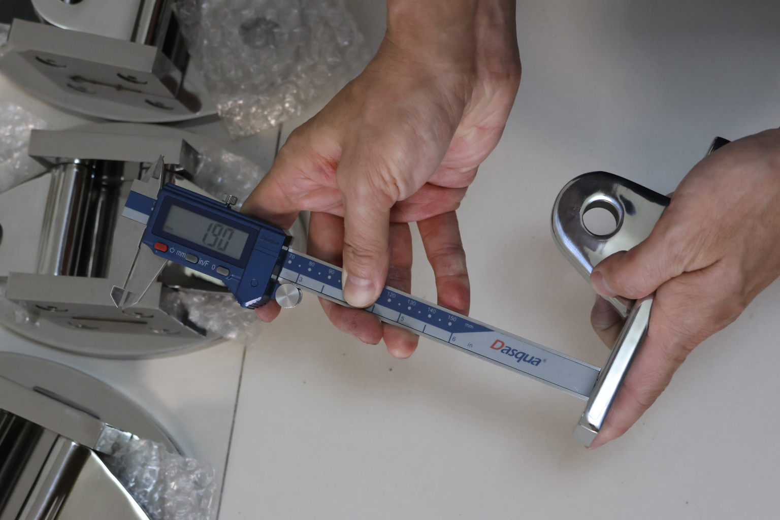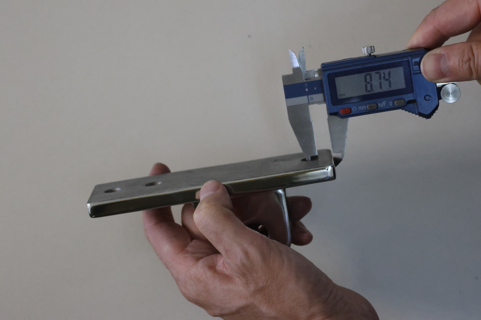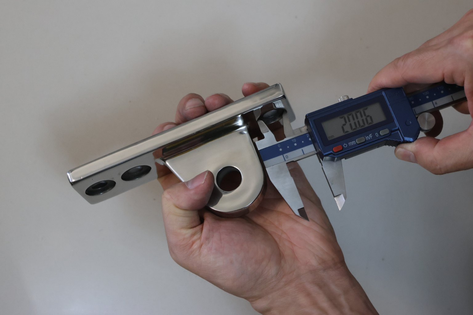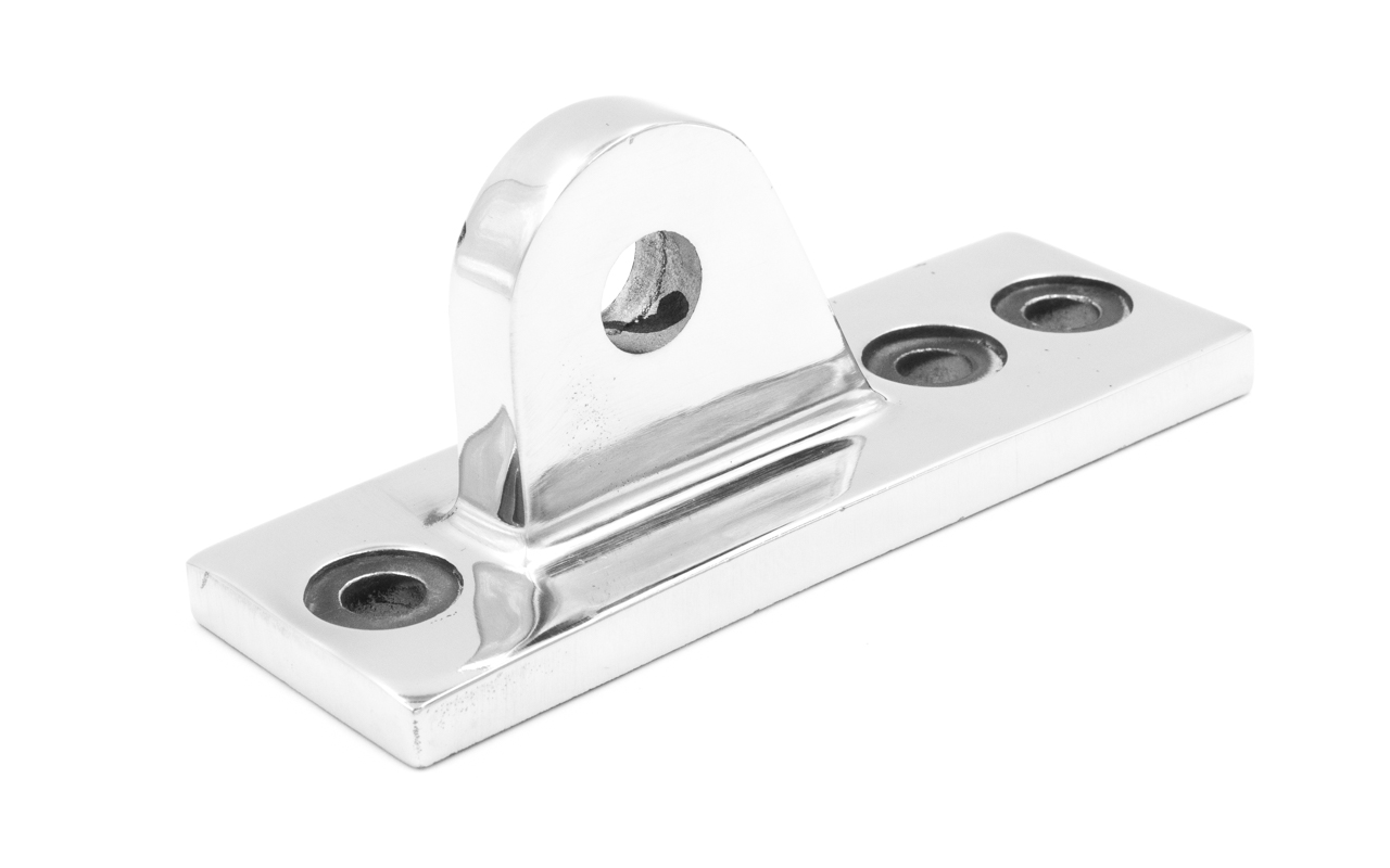 Крепление тяги к стойке. Полированная деталь. Состоит из крепёжного элемента с тремя технологическими отверстиями для крепления к стойке и выносной части с отверстием диаметром 16 мм для крепежа наконечника тяги. Выполнена из стали AISI 304. Ширина детали – 50 мм. Выносная часть выступает на 63 мм от стены.