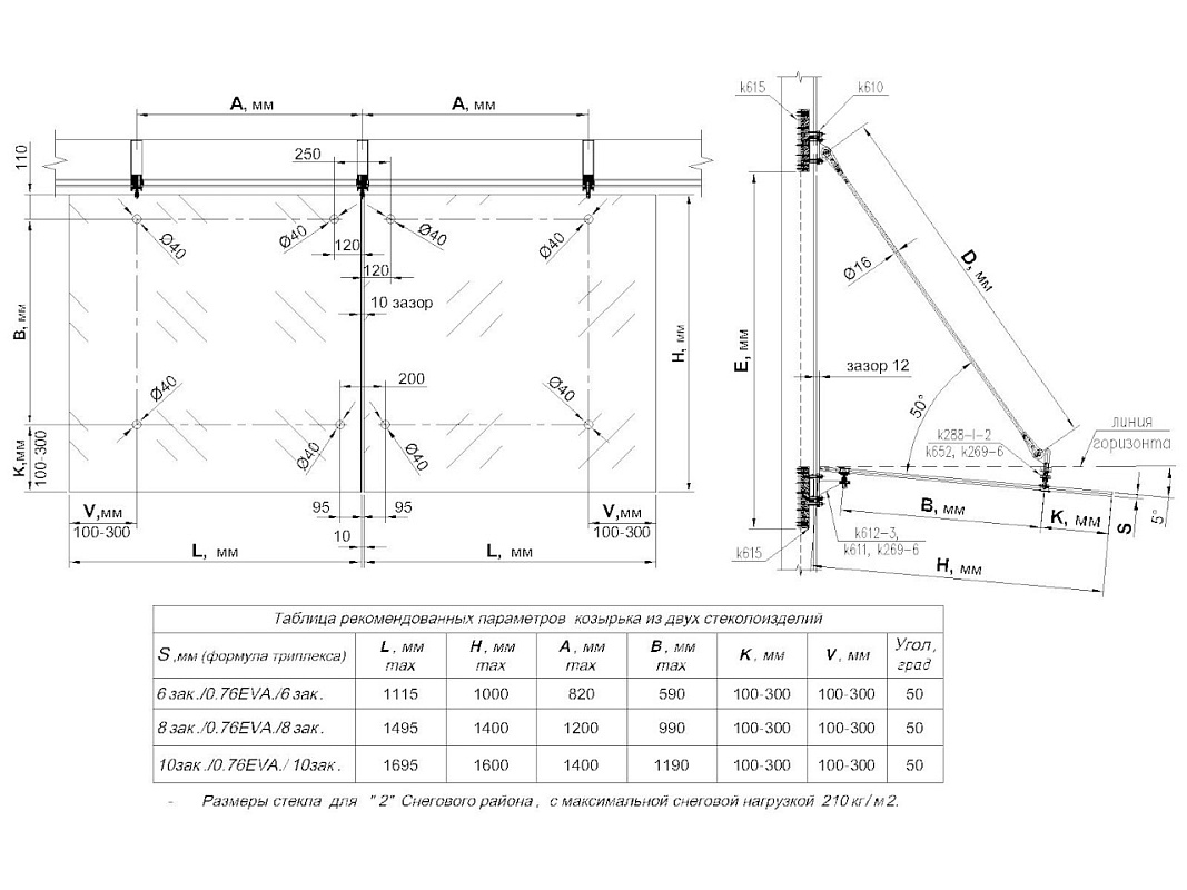 Применяется при монтаже козырьков из стекла, навесов над входом в магазин, козырьков над входом в подвал или над местом курения. Один из самых ответственных элементов крепления козырька. Отвечает за крепление конструкции непосредственно к зданию, и несёт на себе весь её вес. Весовая нагрузка составляет 5кН, ветровая – также 5 кН.
