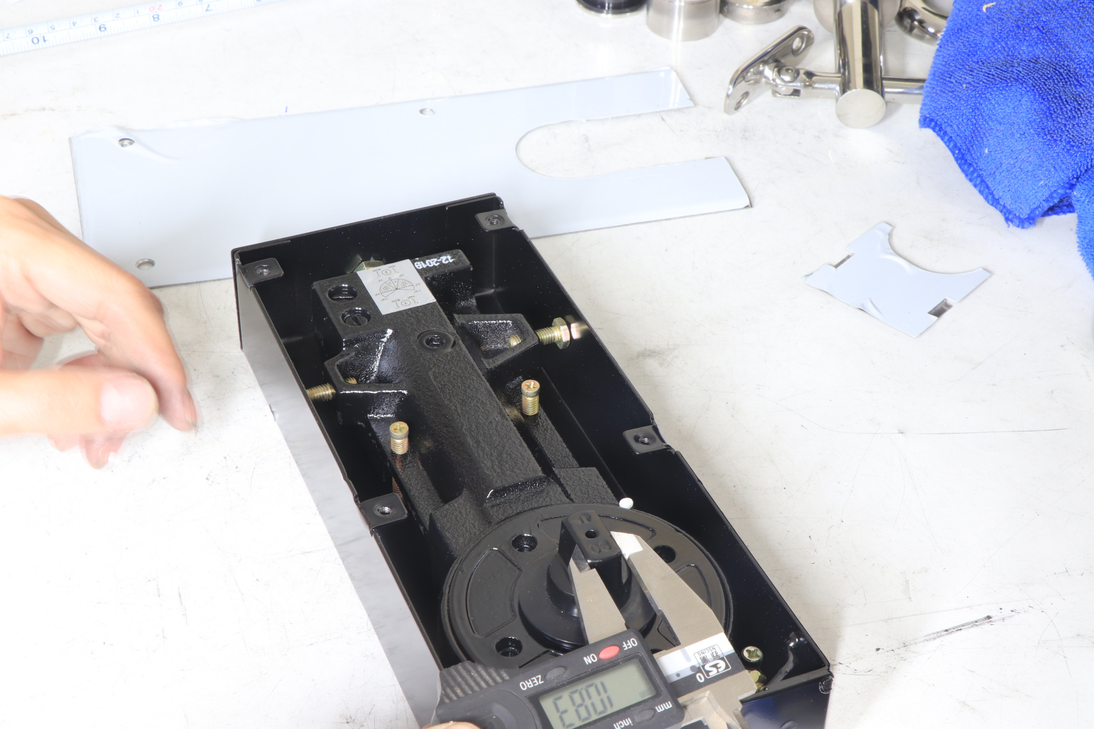 Опустите тело доводчика в кожух и отрегулируйте расположение тела доводчика параллельно створке. За счет винтов затяжки в тело кожуха можно регулировать доводчик относительно двери в пределах 8 -10 мм. Установите шпиндель.