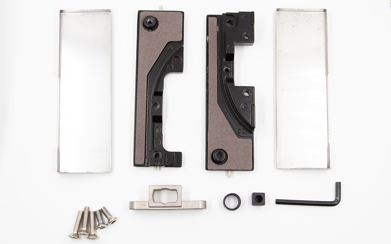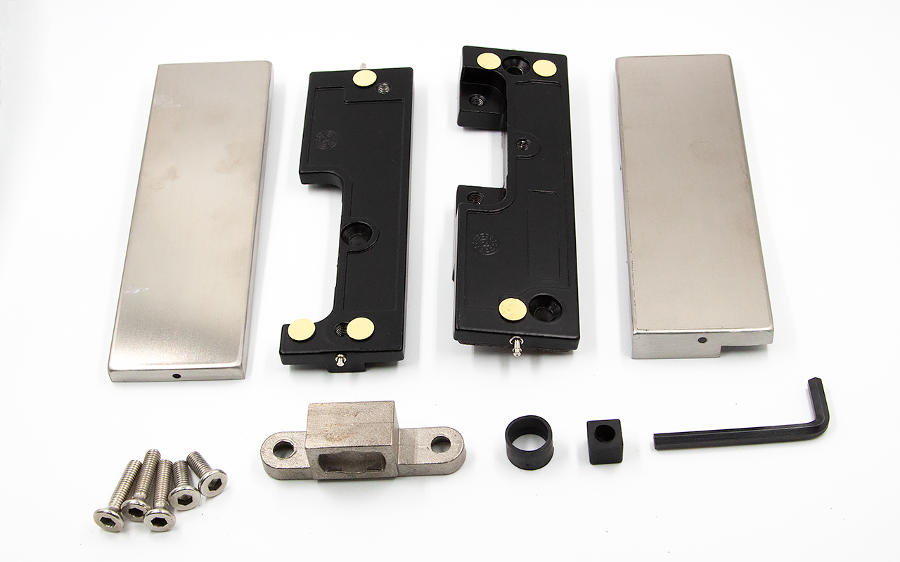 Сбоку нажимаем на крепления крышек и снимаем. Отвинчиваем винты, и фиксируем фитинг в подготовленный вырез в стекле. Далее закручиваем и фиксируем обратно крышки.