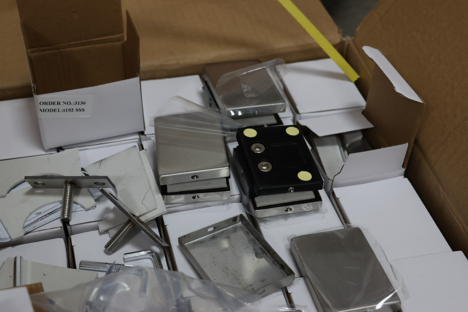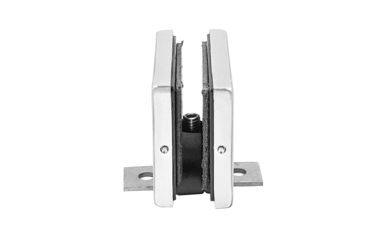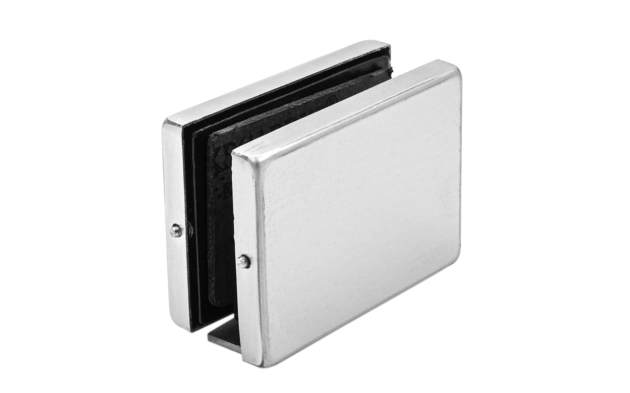 Коннектор разбирается на две половинки, основание металлической пластины крепится к стене на саморезы. Затем к нему прикладывается стекло со специальными полукруглыми вырезами, а далее второй половинкой стекло зажимается.