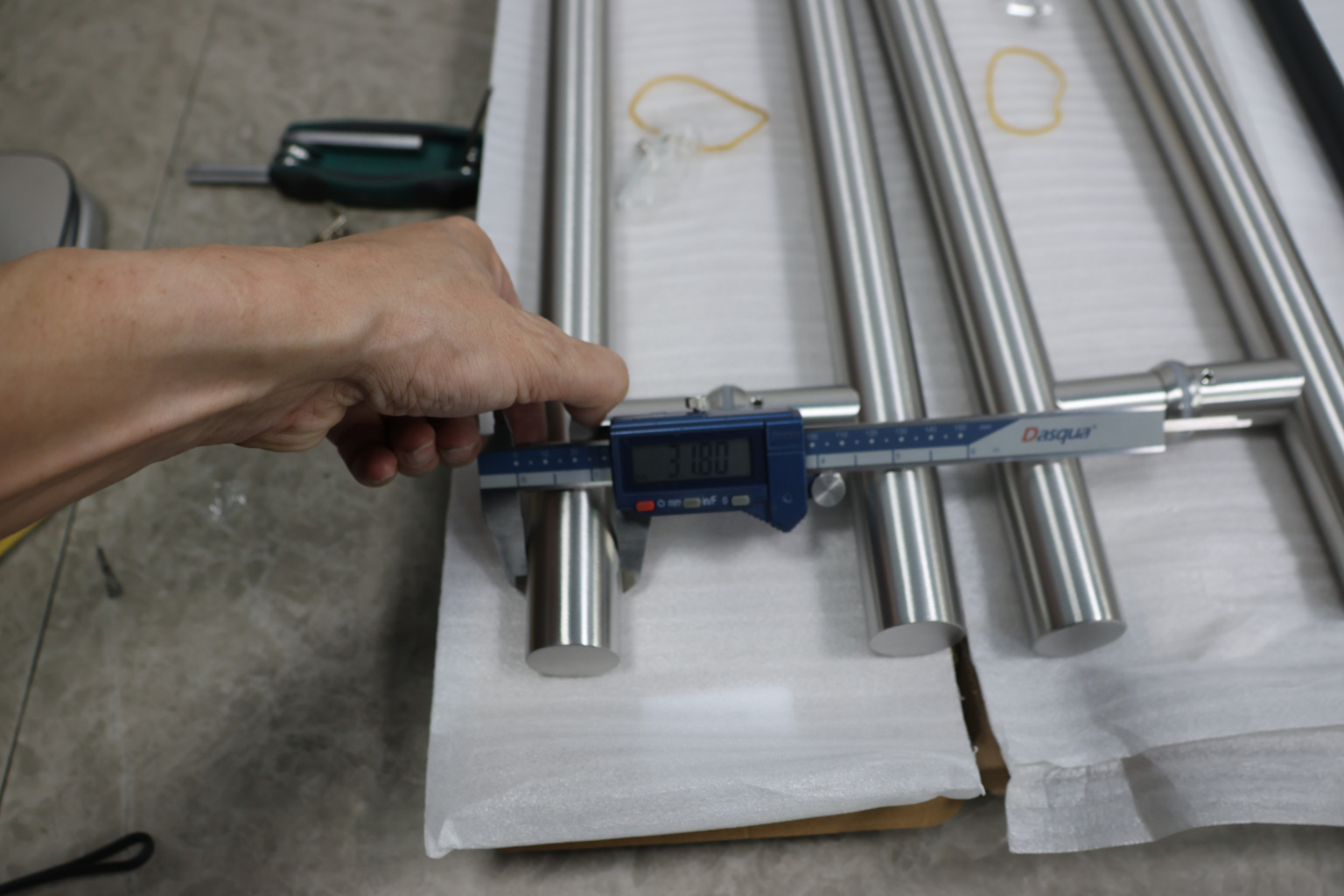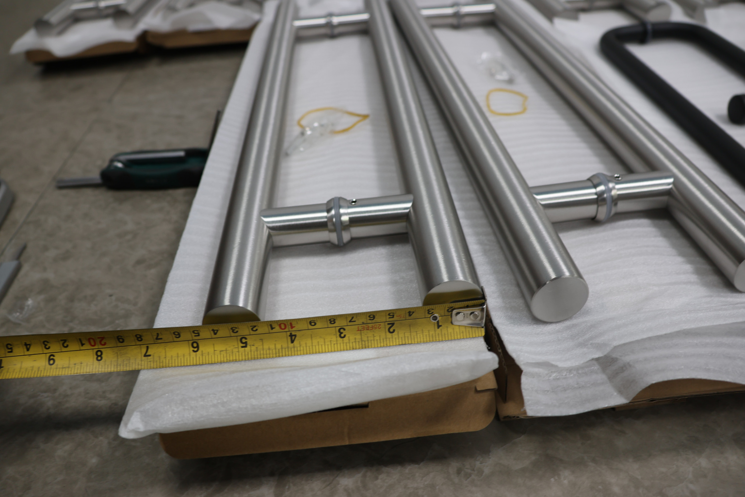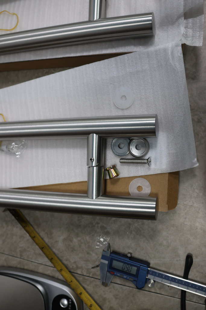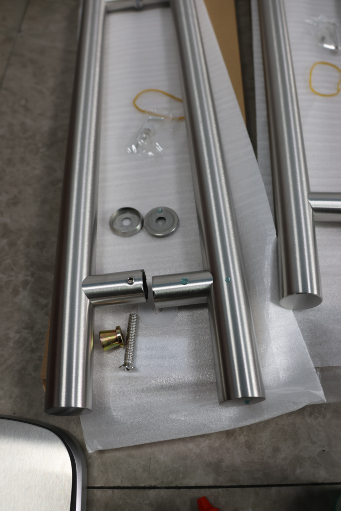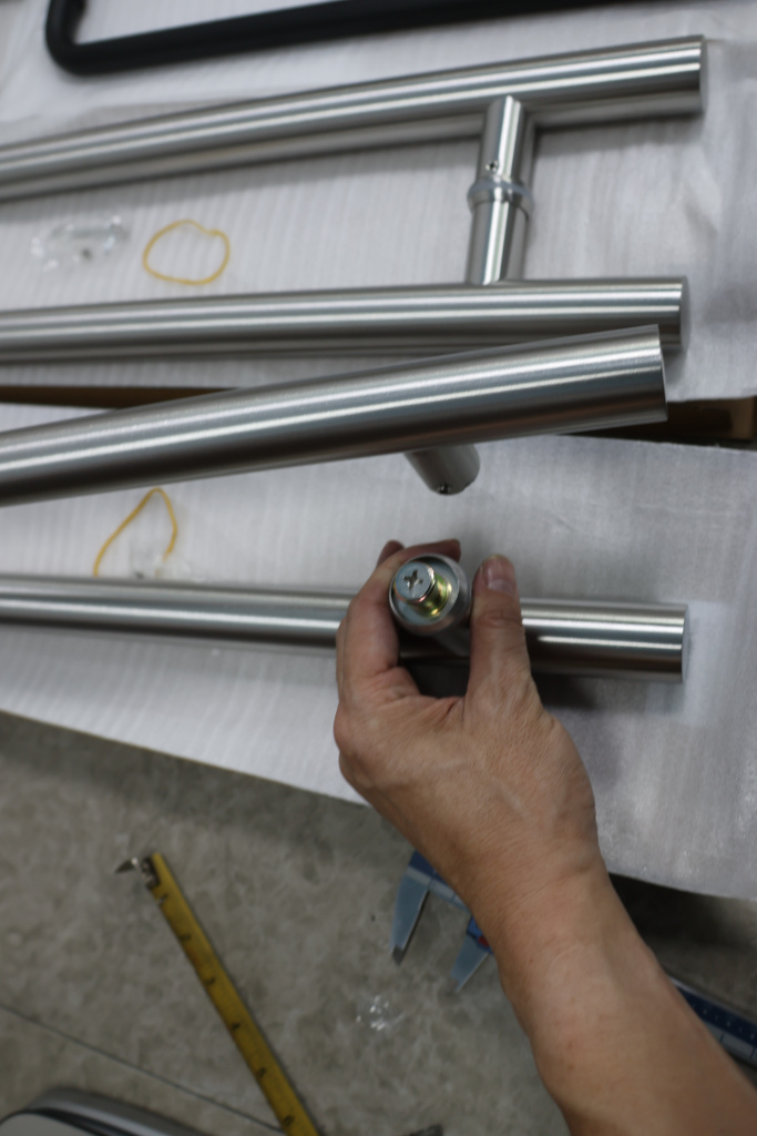 у основания ручки откручиваем с помощью шестигранника винты, делим ручку на две части, в заранее заготовленные отверстия вырезы в стекле 10-12 мм фиксируем первую часть ручки в отверстиях и с обратной стороны ответную часть затягиваем с помощью шестигранника