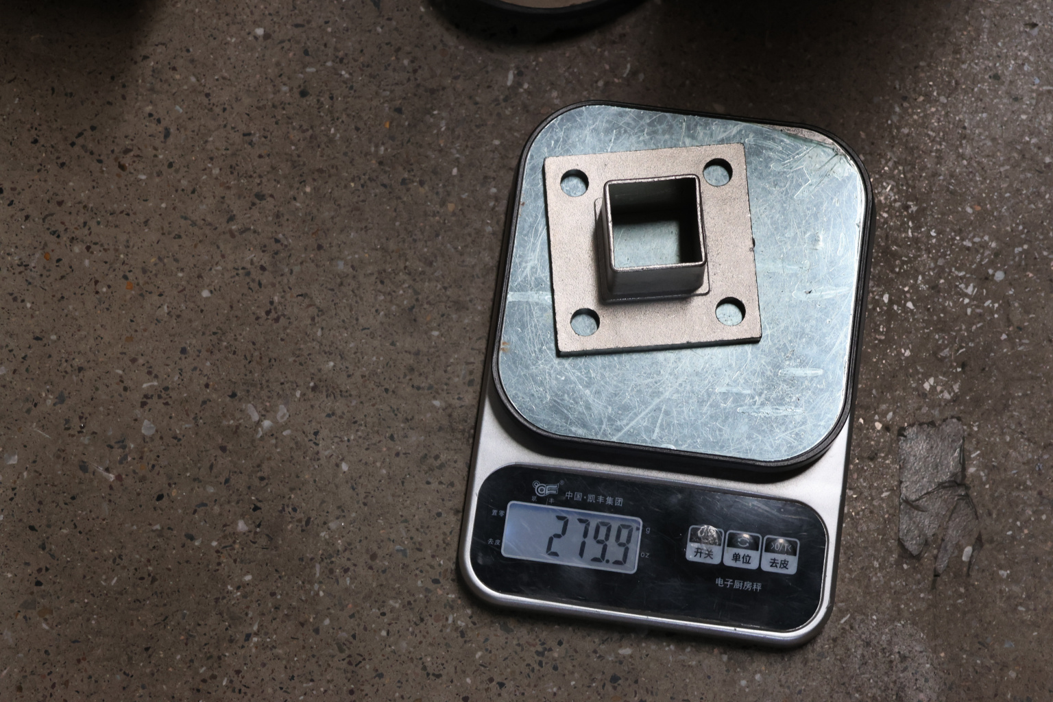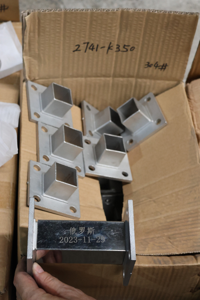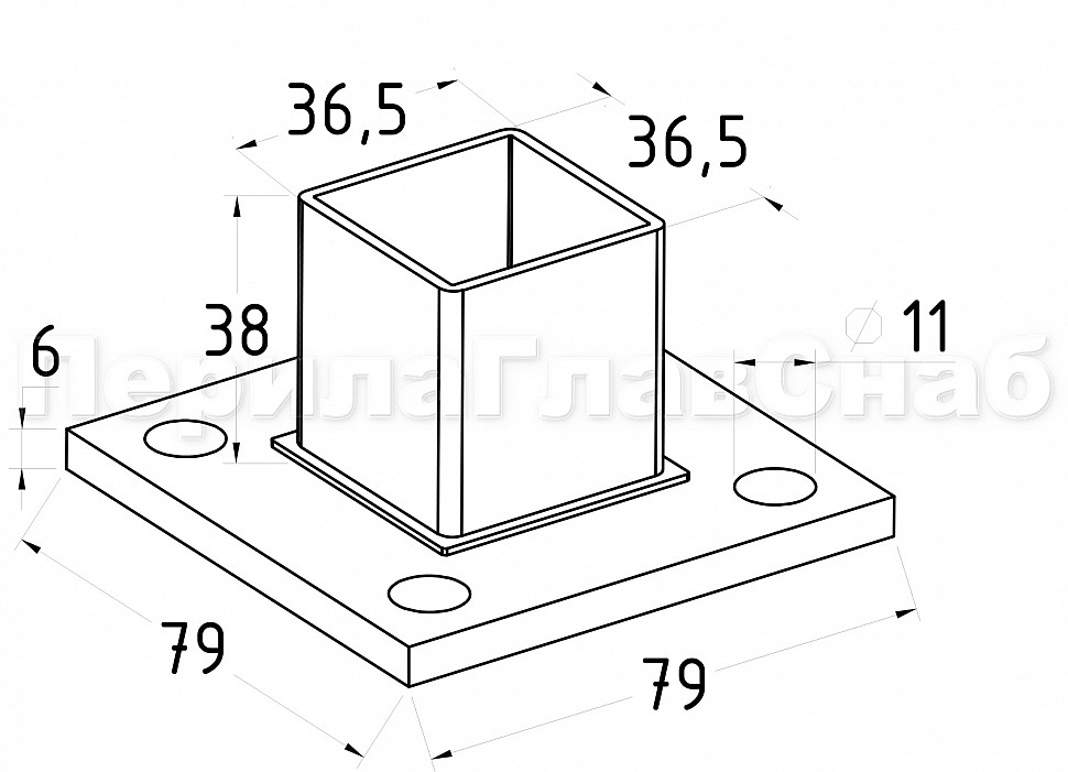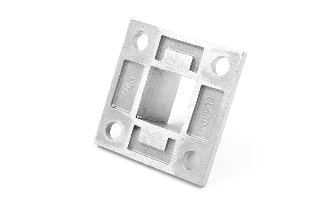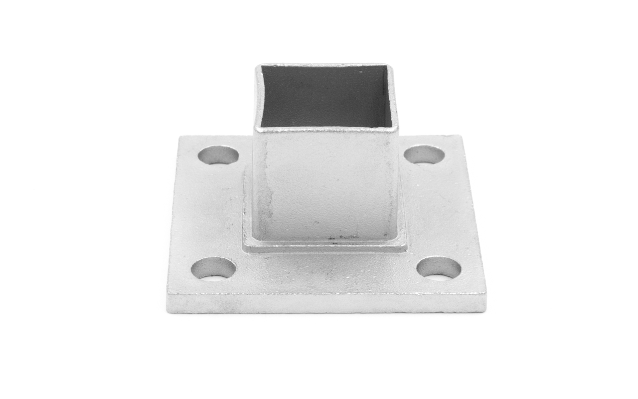 Фланец для трубы 40х40 мм с четырьмя отверстиями. Деталь литая, шлифованная, закладная под стойку. Марка стали - AISI 304