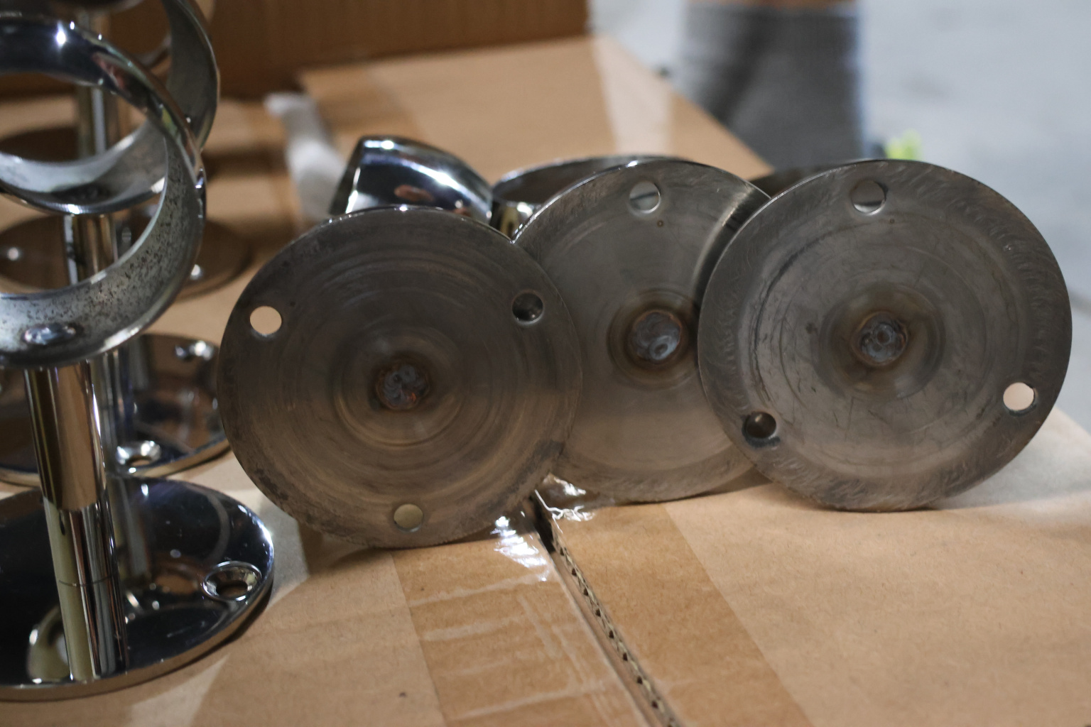 Держатель выносной с обхватом для трубы диаметром 50.8 мм. Три отверстия под саморез с потайной головкой 5 мм. Деталь полированная, сварная. Марка стали детали - AISI 304.