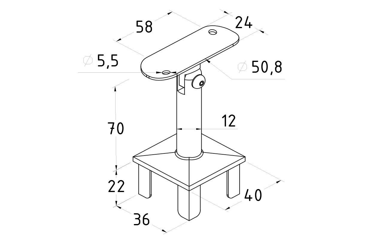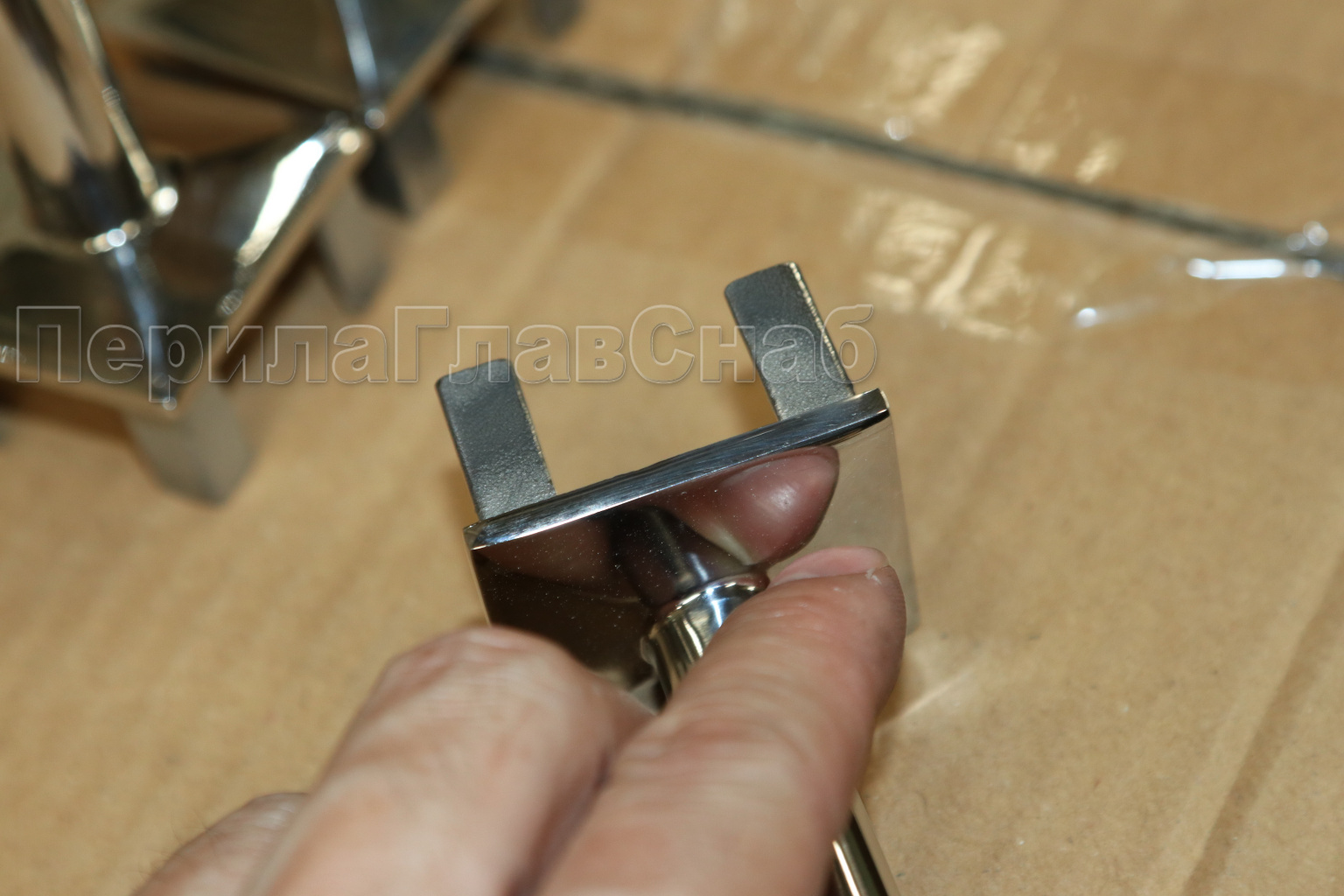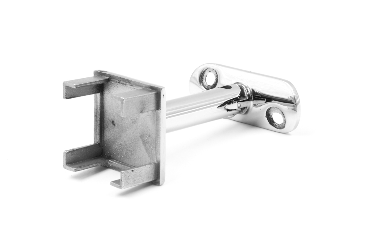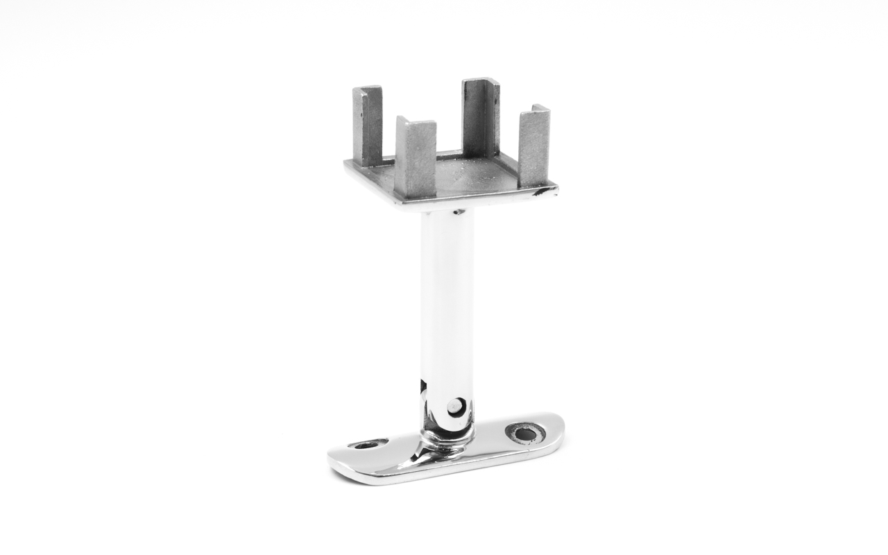 Наконечник палец на стойку из профильной трубы диаметром 40х40 мм, с регулируемым ложементом под поручень Ø50.8 мм. Деталь полированная, литая, облегченная нержавеющая. Марка стали - AISI 304