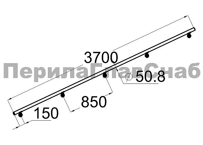 Готовый пристенный поручень с 5 держателями, длина 3700мм (aisi 304)