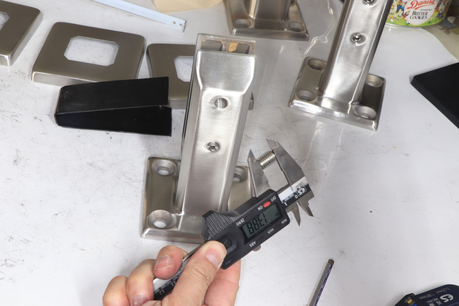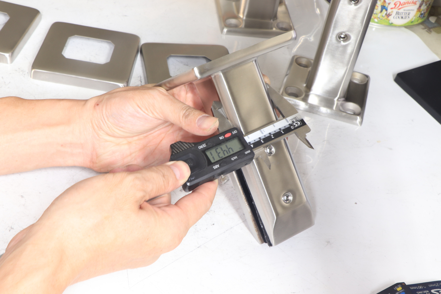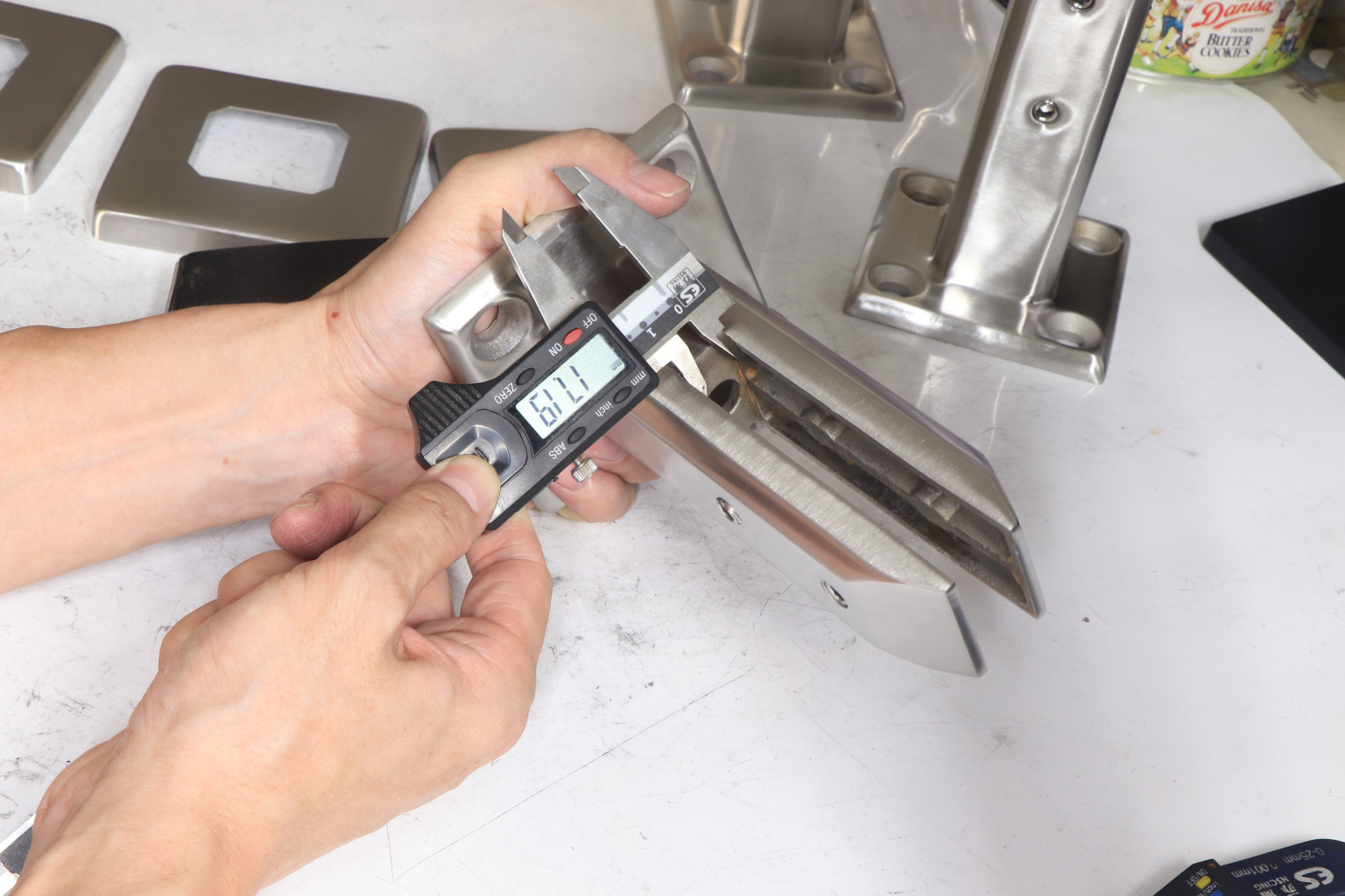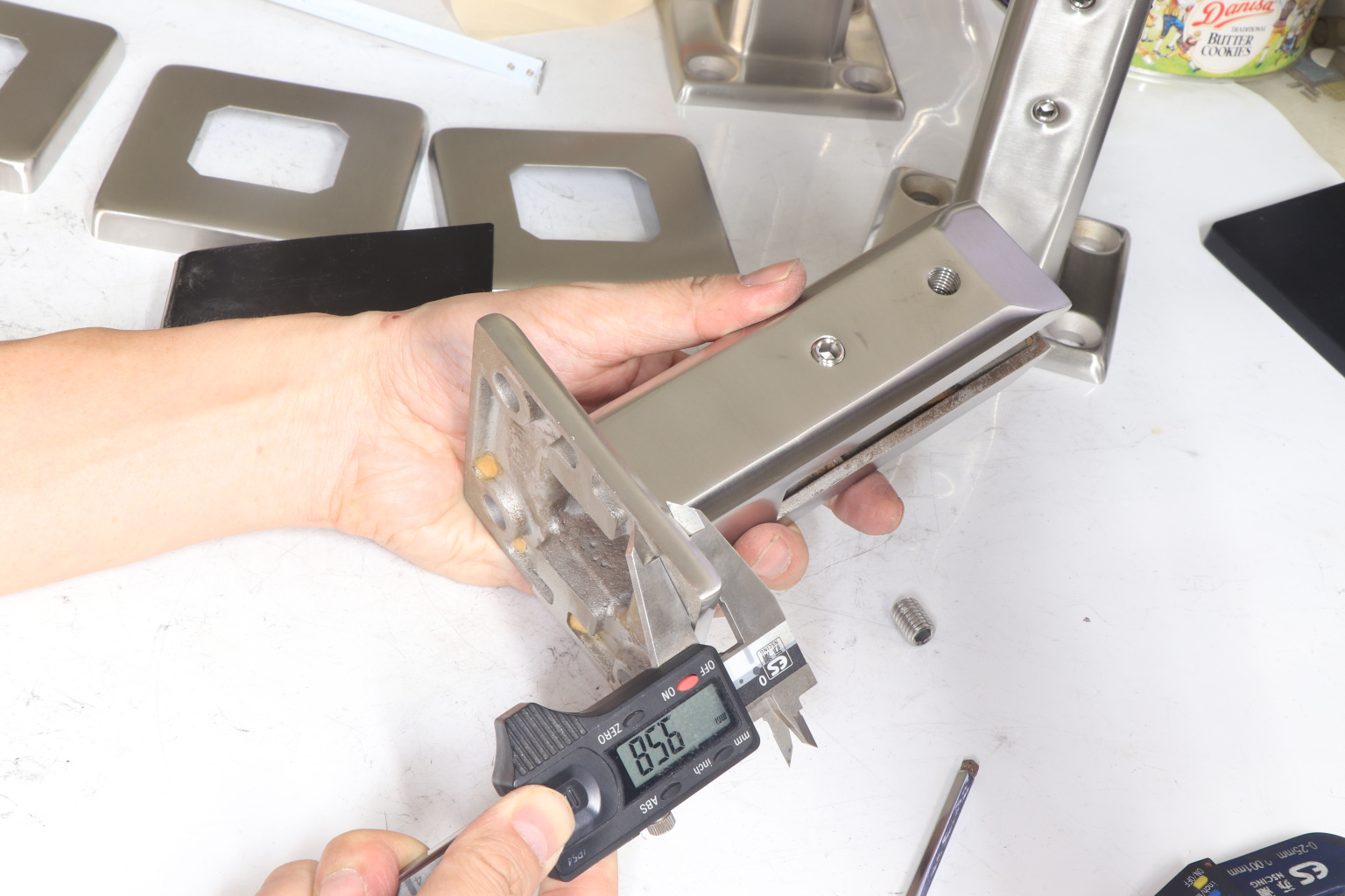 Держатель крепится в пол на 4 анкера или шпильки. Для этого предусмотрено 4 отверстия диаметром 10мм-12мм. Стекло зажимается в стеклодержатели с помощью двух фиксирующих винтов. Высота ограждения должна быть не более 1200 мм от пола.