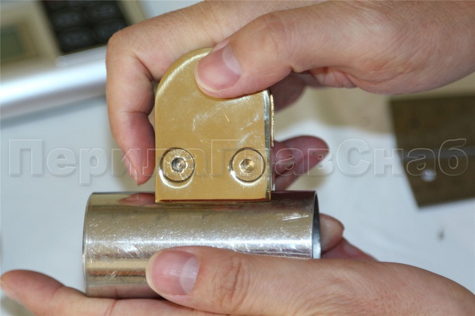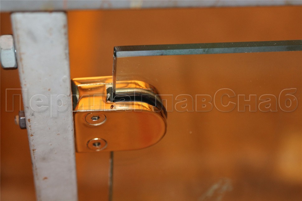 Приваривать фурнитуру с покрытием нитрид титана строго запрещается, так как при горении выделяются токсичный газ. Стеклодержатель крепится на саморез или заклепку.