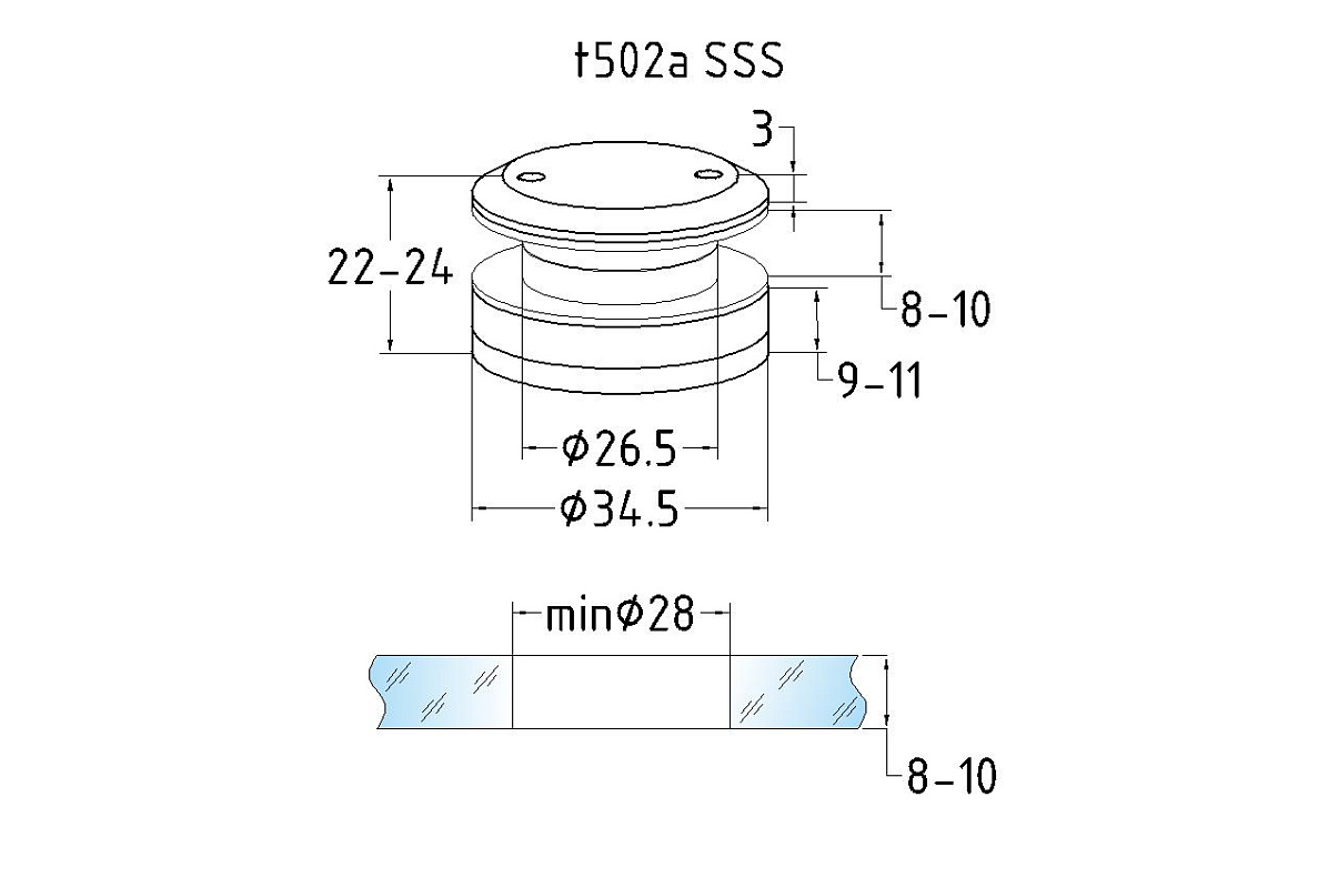 Точечный стеклодержатель 8.5-10.5 мм, регулируемый, без зенковки, для стекла 8-10 мм t502A SSS