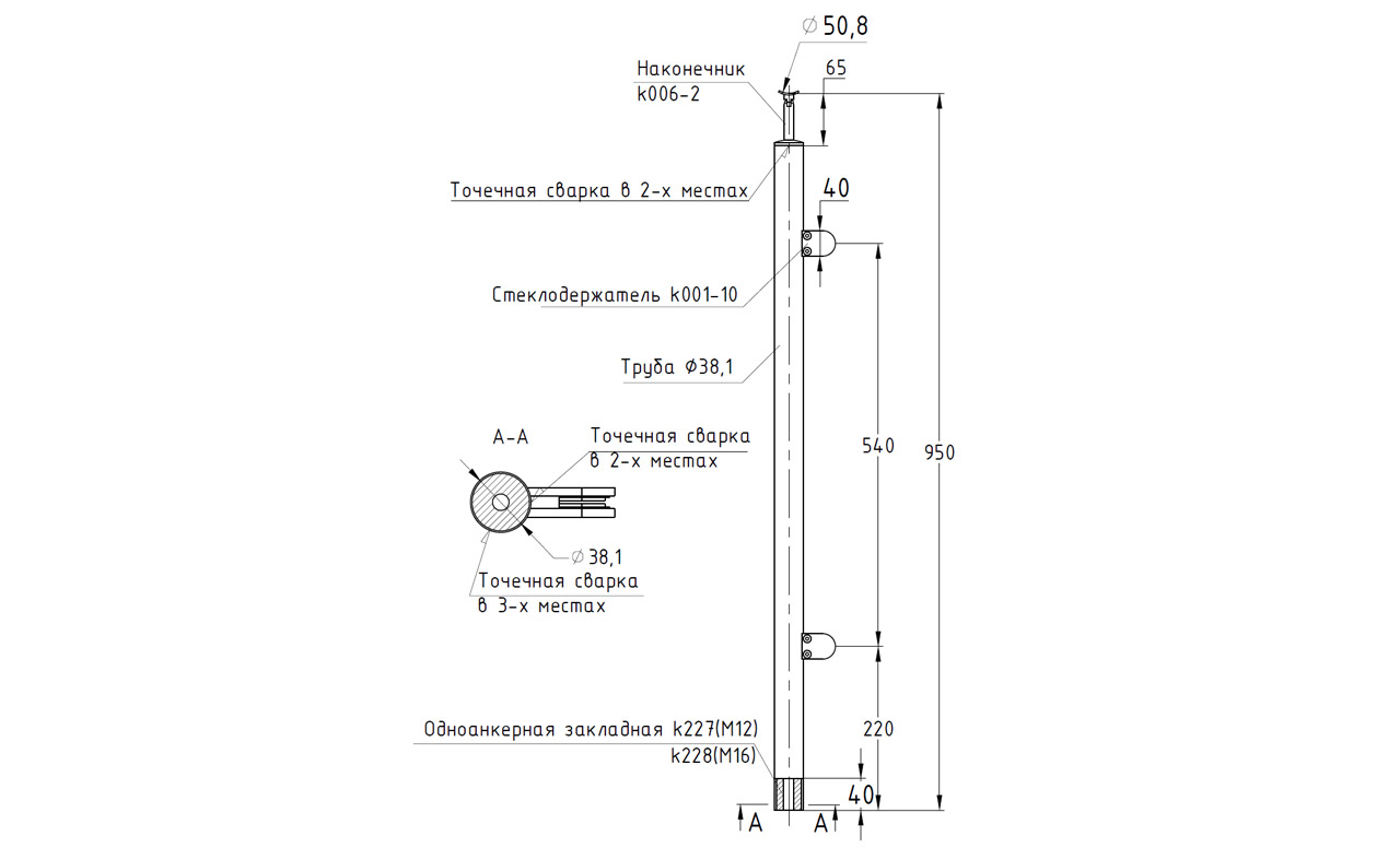 Стойка круглая Ø38.1: 2 литых зажимных стеклодержателя, полированная, с одноанкерым крепежом, высота 950 мм (AISI 304) k736-R