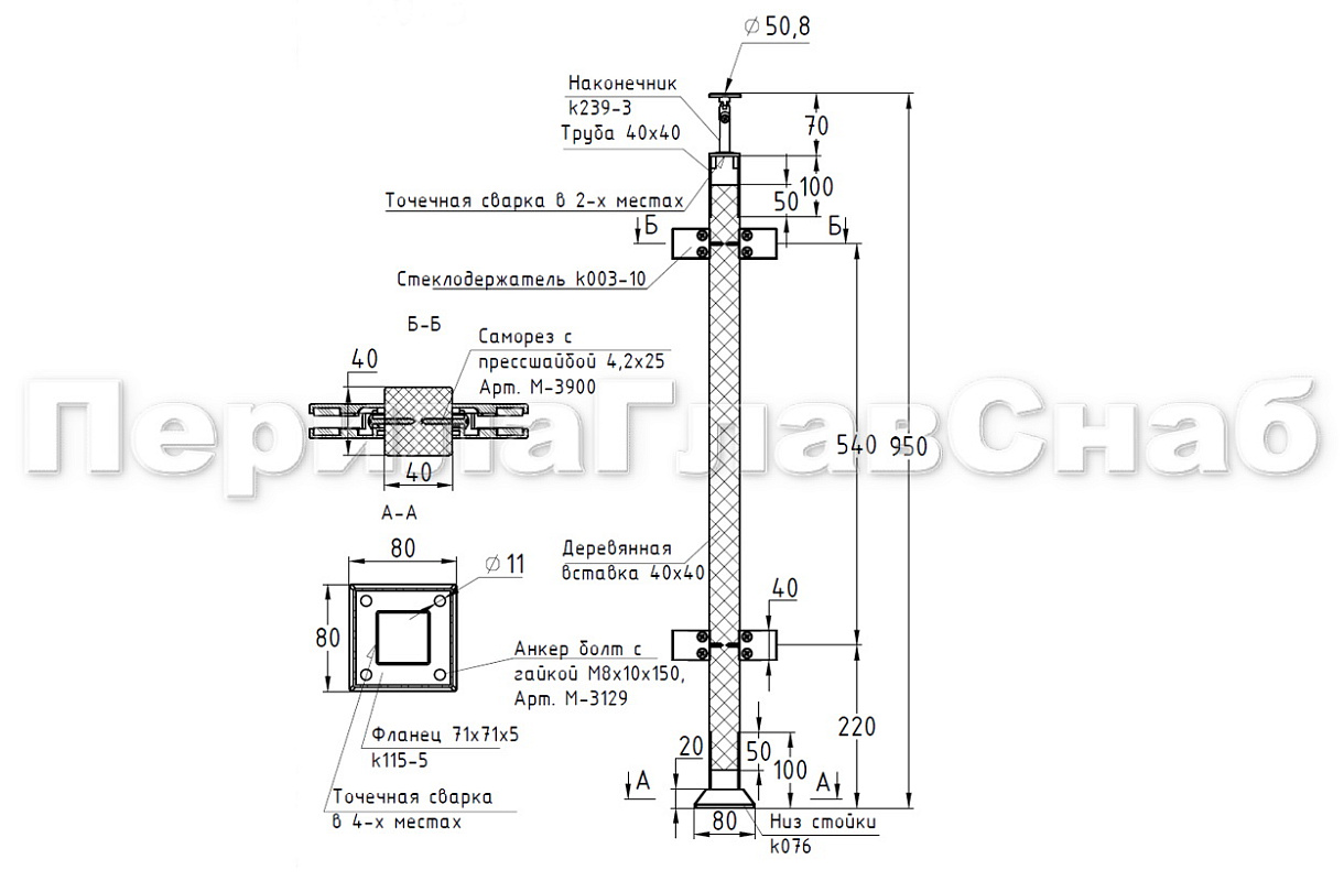 Готовые стойки – это экономия вашего времени и денег. Приобретая готовую стойку Вы можете собрать ограждение сами, не привлекая монтажную бригаду и экономя денежные средства на монтаже. Стойка легко монтируется к полу благодаря четыреханкернуму фланцу с отверстиями под анкер-болт М8 ( , , ) или шпильку ( ; ) в комплекте с хим анкером или , а крепеж скрывает декоративная крышка идущая в комплекте стойки. Поручень из нержавеющей стали можно закрепить при помощи самореза (, , ), либо при помощи заклепки () и винта М6 (М-3973) что на порядок эффективней, для крепления при помощи заклепок необходимо растачивать отверстие в ложементе. Если вы используете деревянный поручень, то его можно закрепить при помощи саморезов ( , , ). После покраски дубовой проставки подклеиваете клеем ( , ). Ограждение готово!