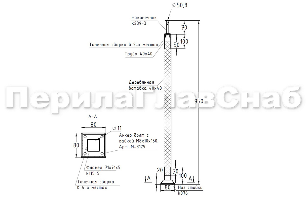 Стойка квадратная 40х40: полированная базовая, с плоским наконечником, высота 950 мм k743-9