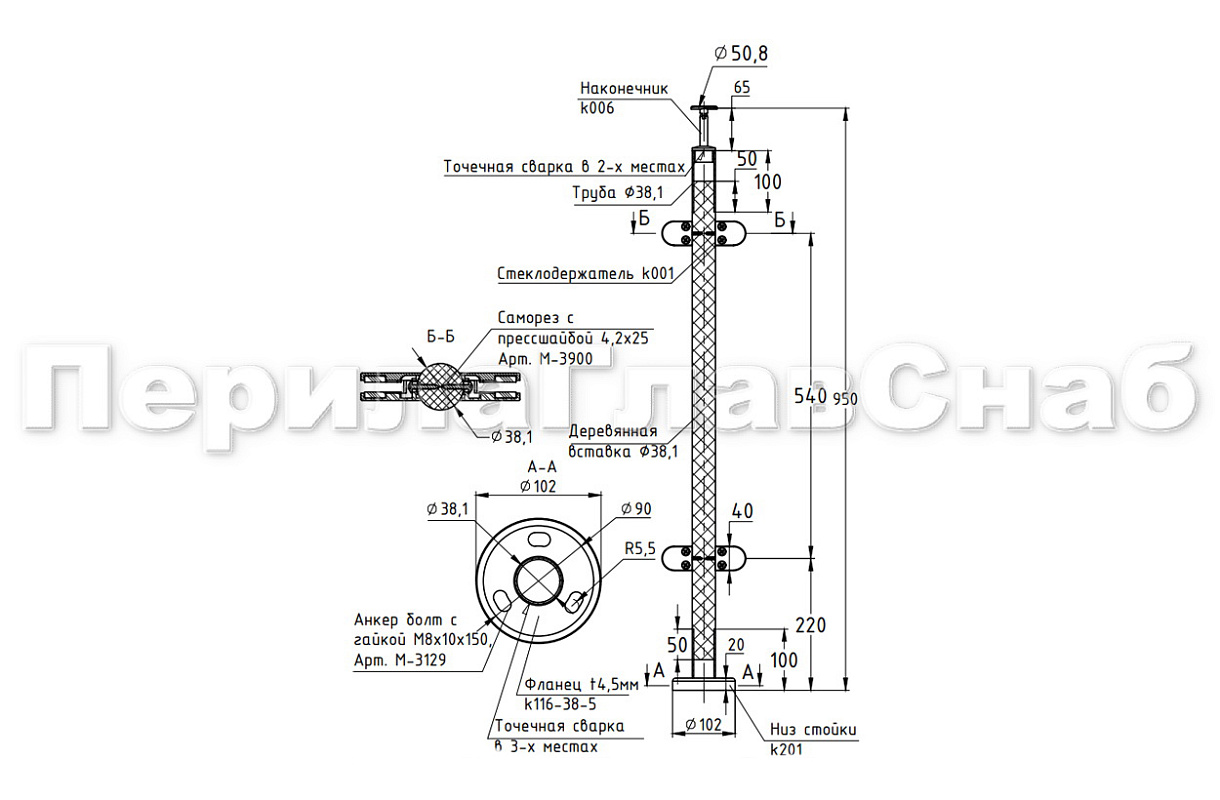 Готовая стойка Ø38,1 мм, с фланцем и наконечником, высота 950 мм, полированная (AISI 304) k702 купить в Краснодаре