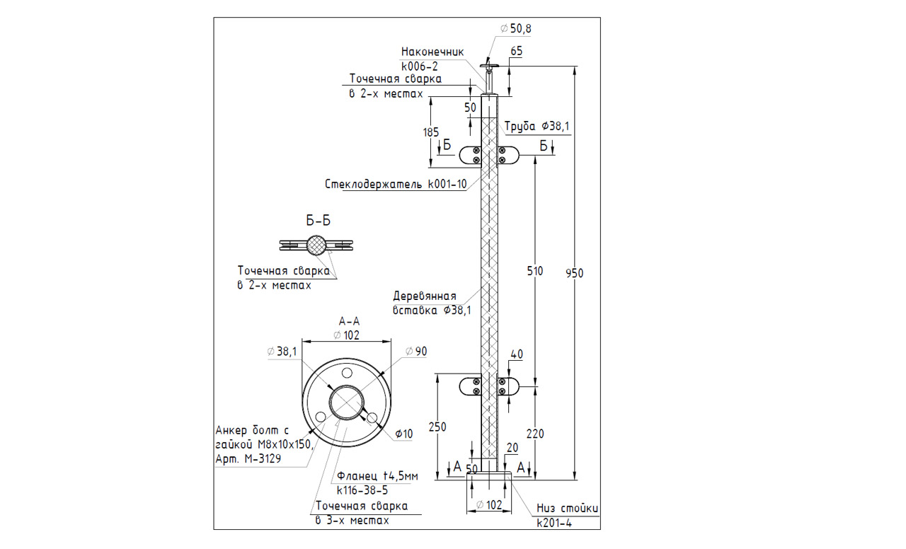 Готовые стойки – это экономия Вашего времени и денег. Приобретая готовую стойку Вы можете собрать ограждение сами, не привлекая монтажную бригаду и экономя денежные средства на монтаже. Стойка легко монтируется к полу благодаря треханкернуму фланцу с отверстиями под анкер-болт М8 ( М-3129М-3843М-3838) или шпильку ( М-3959М-3969)  комплекте с хим анкером Ф-0799 или Ф-0800., а крепеж скрывает декоративная крышка идущая в комплекте стойки. Поручень из нержавеющей стали  можно закрепить при помощи самореза ( М-3850М-3847М-3215), либо при помощи заклепки ( М-3214) и винта М6 ( М-3973) что на порядок эффективней, для крепления при помощи заклепок необходимо растачивать отверстие в ложементе. Если вы используете пластиковый ( k893k897k892k891k894k895k899) или деревянный поручень, то его можно закрепить при помощи саморезов ( М-3217, М-3850М-3215)). После покраски дубовой проставки подклеиваете клеем ( ф-1127, ф-1105). Стекло заказывается после установки стоек и снятия размеров. После того, как стекло готово к установке, при помощи шестигранника ( k931k932) разъединяете стеклодержатель, надеваете стекло и закручиваете обратно. Ограждение готово!