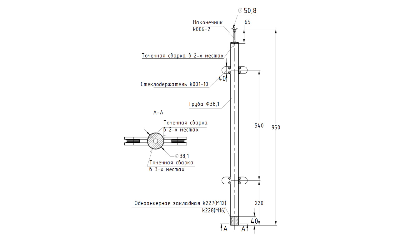 Готовая стойка O38,1мм, с одноанкерным крепежом под шпильку М12 и наконечником, высота 950мм, полированная (aisi 304)