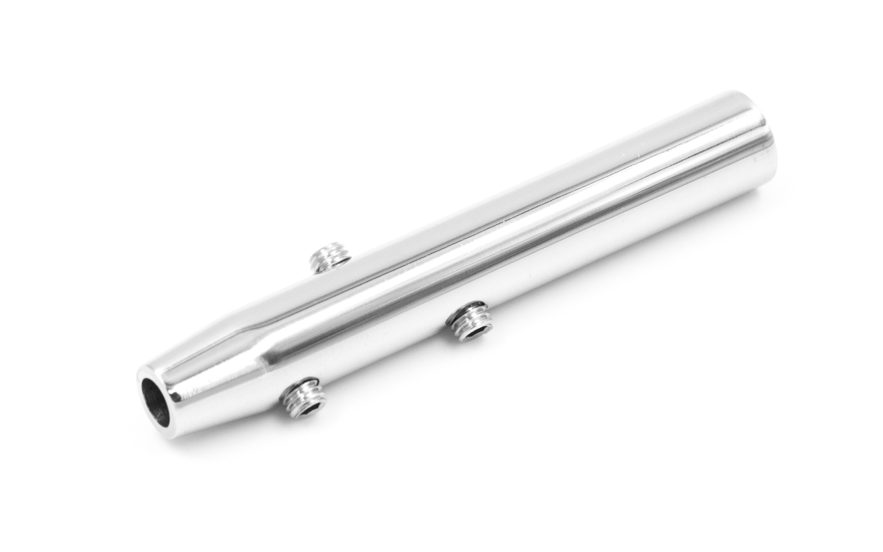 Нержавеющий держатель + натяжитель троса, литой, 80х12 мм, для троса Ø5 мм, полированный (AISI 304). Используется для крепления троса к стойкам различного диаметра, а также к плоской поверхности.