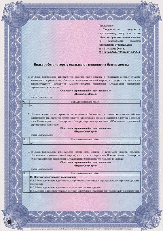 Приложение к Свидетельству о допуске к определенному виду или видам работ, которые оказывают влияние на безопасность объектов капитального строительства (кроме особо опасных и технически сложных объектов использования атомной энергии) и о допуске к которым член «Некоммерческого партнерства Первая Национальная Организация Строителей»