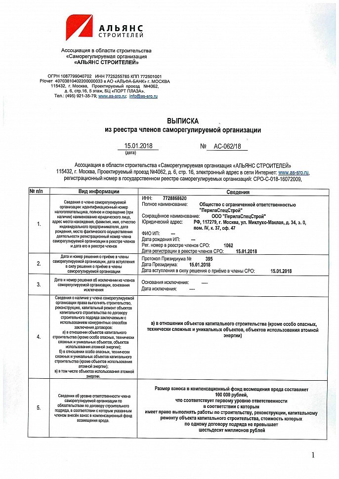 Данный документ, в соответствии со ст.52 Градостроительного Кодекса РФ, подтверждает возможность ООО «ПерилаСпецСтрой» осуществлять работы по договорам о строительстве, реконструкции, капитальном ремонте объектов капитального строительства , заключенным с застройщиком, техническим заказчиком, а также лицом, ответственным за эксплуатацию здания/сооружения и региональным оператором.