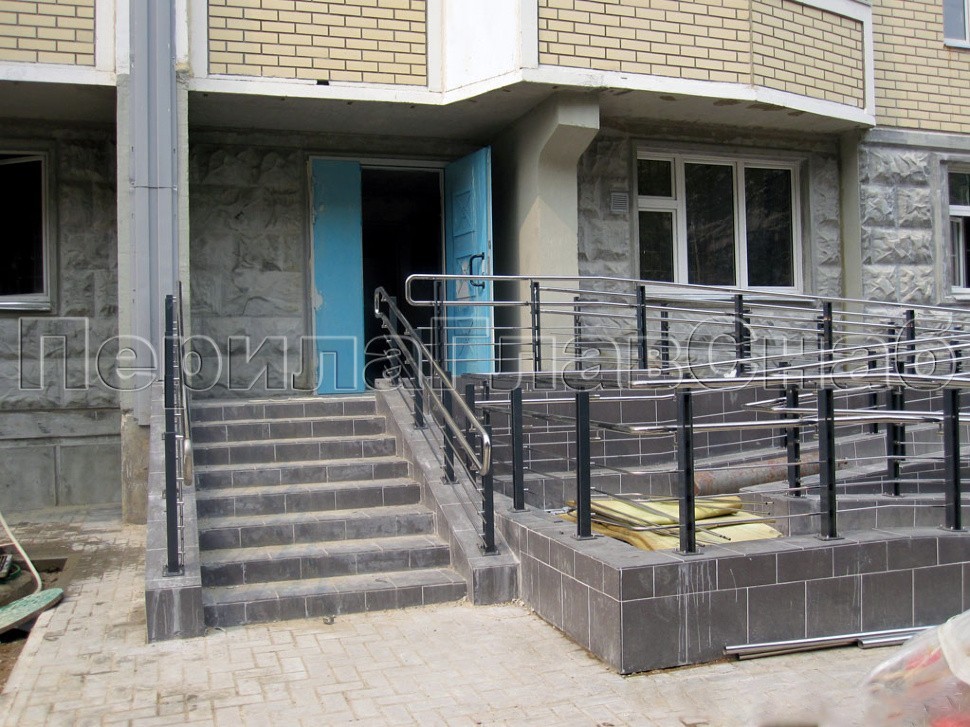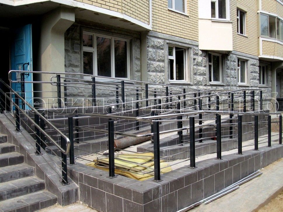 Вдоль фасада дома и у каждого подъезда были установлены входные группы и ограждения пандусов для маломобильной категории граждан: инвалидов, лиц пожилого возраста и детей.