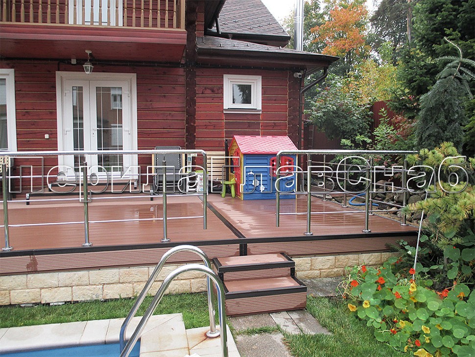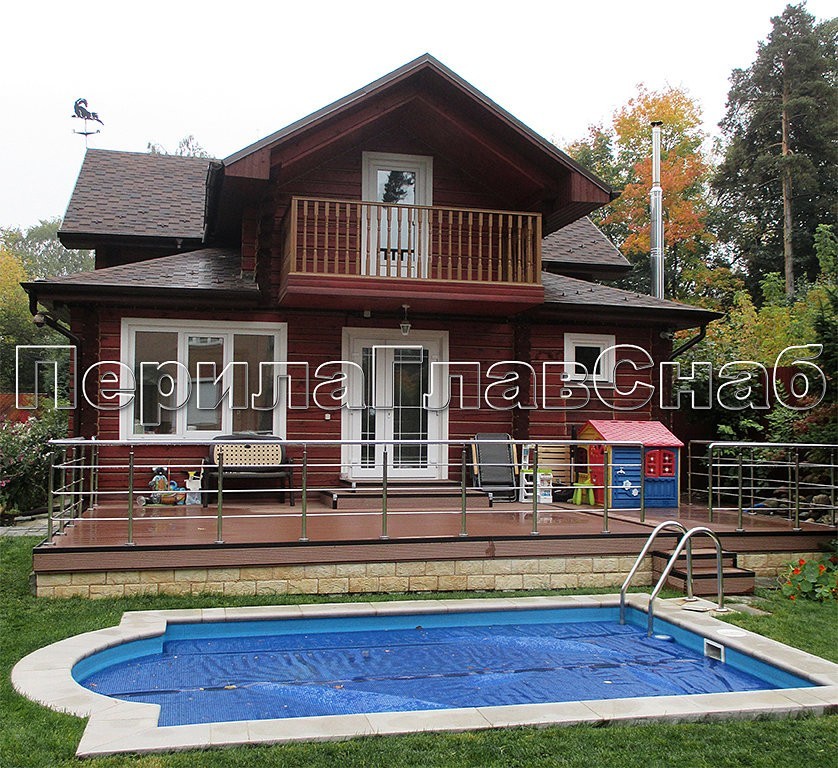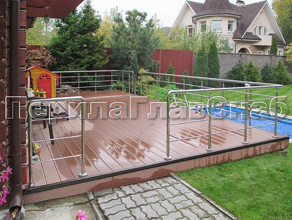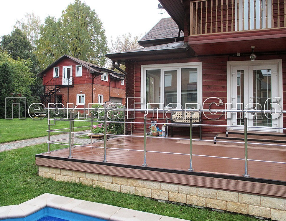 Нержавеющее ограждение для загородного дома с круглыми стойками и поручнем.
