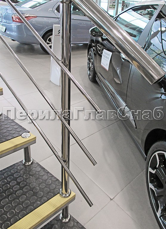 Трехлаерное ограждение. Ригеля приварены к круглой стойке из нержавеющей стали.