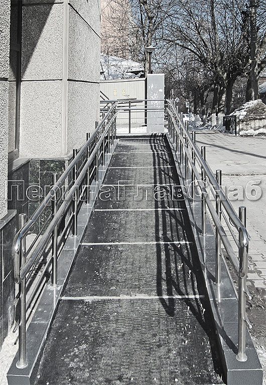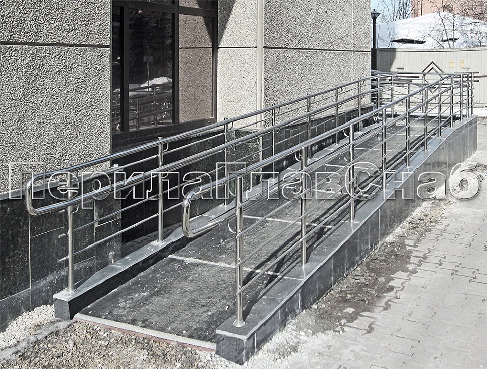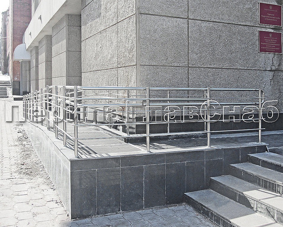 Двойной поручень, сделанный специально для людей с ограниченным возможностями в передвижении. Стойки ограждения сделаны из нержавеющей стали.