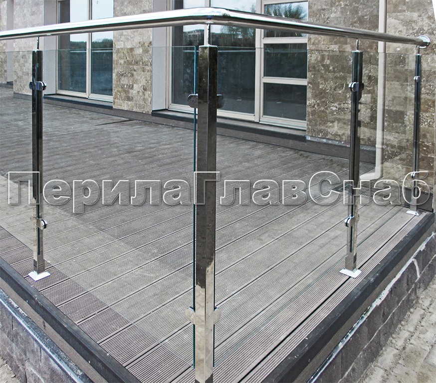 Ограждение со стеклянным заполнением. Квадратные стойки из нержавеющей стали. Круглый поручень крепится к стойкам через наконечник типа "палец".