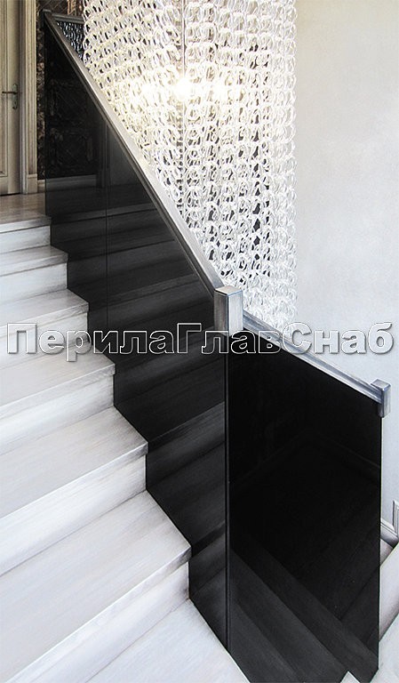 Поручень из нержавеющей стали на стеклянном ограждении с матированным стеклом.