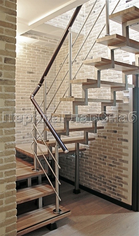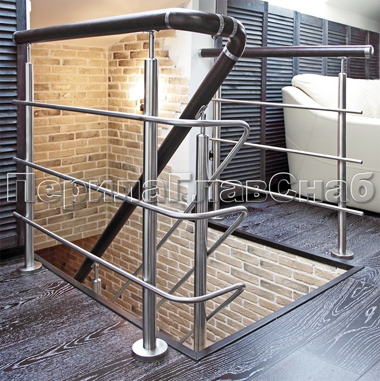 Ограждение из нержавеющей стали с деревянным поручнем.