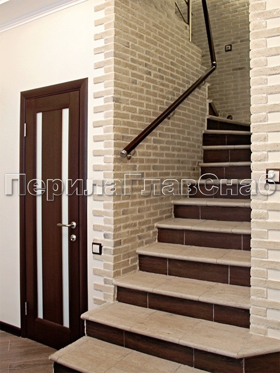 Пристенный поручень из дуба тонированный под красное дерево в цвет наличников на двери, завязан с основным ограждением с помощью соединителей типа кольцо и деревянных сегментов.
