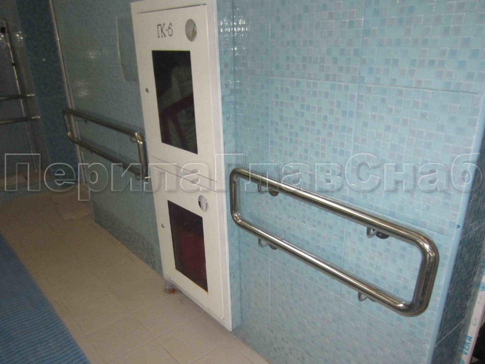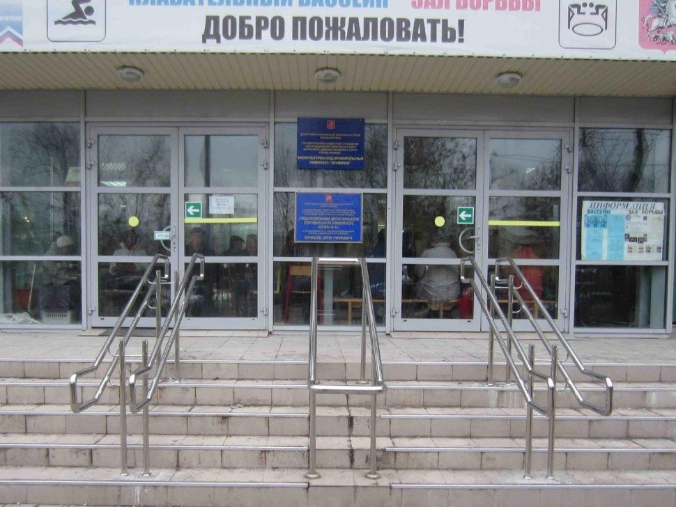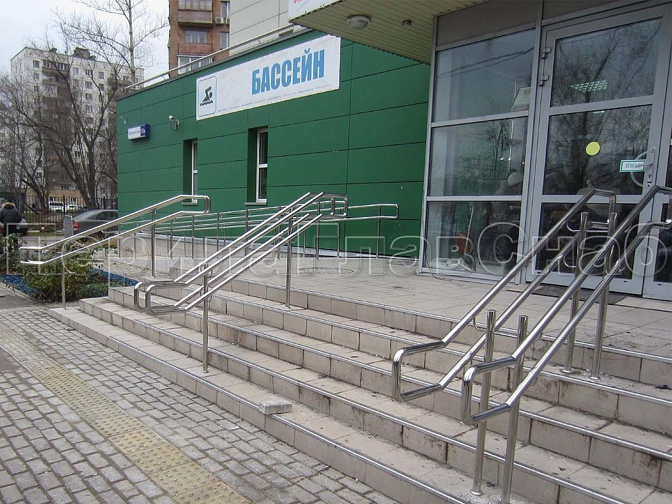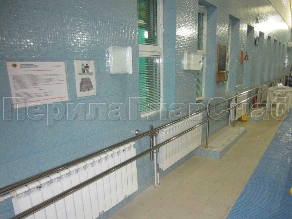 Поручень, установленный на стойках из нержавеющей стали в здании оздоровительного комплекса.