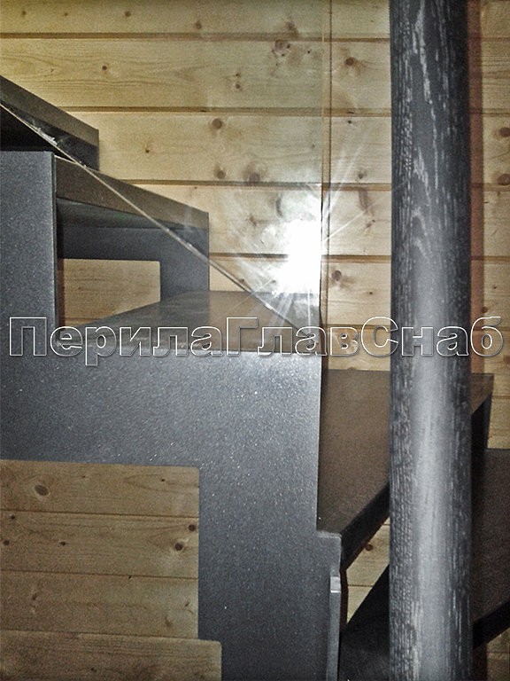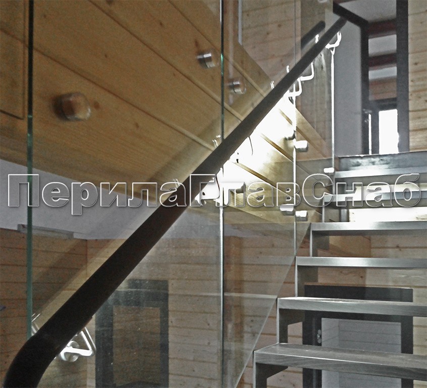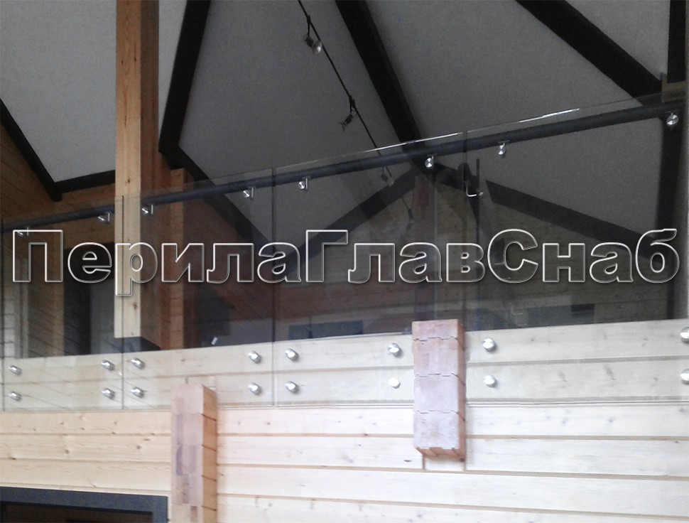Крепление стеклянного ограждения в торец с круглым деревянным поручнем на выносном креплении.