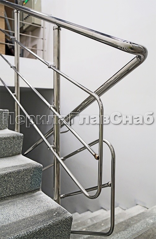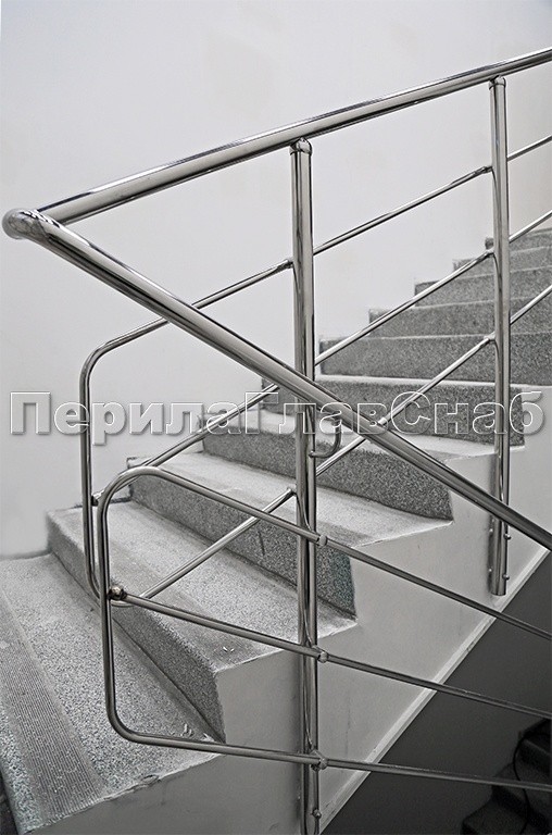Ограждение лестницы из нержавеющей стали. Ригели завязаны травмобезопасно и крепятся к одной и той же стойке с разных сторон.