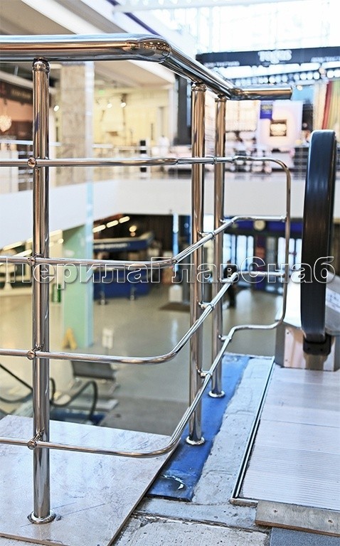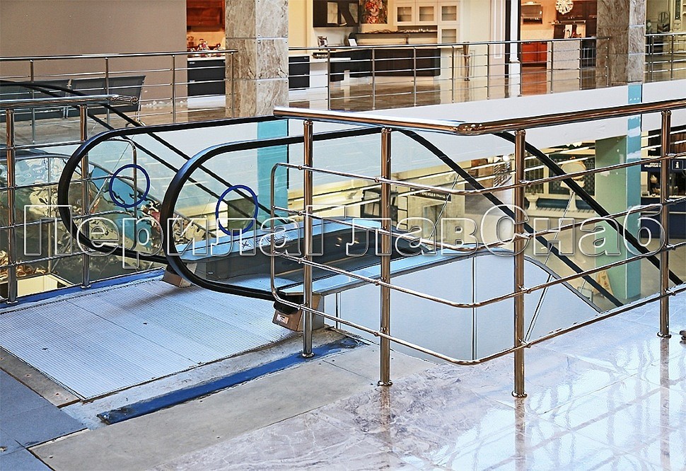 Экономичное примыкание к эскалатору. Стойки д.38 мм, вертикальное заполнение ригелями 16 мм.