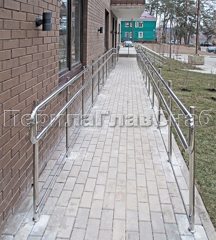 Ограждения для пандусом со сдвоенным поручнем ( выносное крепления для верхнего и нижнего поручня) и с ригелем для увеличения жесткости конструкции. Ограждение пандусов полностью соответствует ГОСТ.