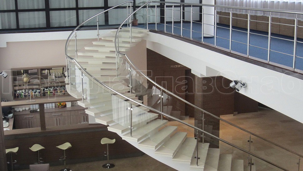 • Цельностеклянные ограждения на лестницу с зажимными стеклодержателями и стойками. Всего было установлено восемь погонных метров ограждения. Поручни и стойки выполнены из нержавеющей стали, а осветленные стекла придают конструкции визуальную легкость и современного изыска в исполнении.