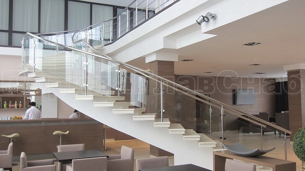 • Далее поручни цельностеклянных ограждений без разрыва переходят в ограждение из нержавеющей стали с тремя ригелями в атриуме.