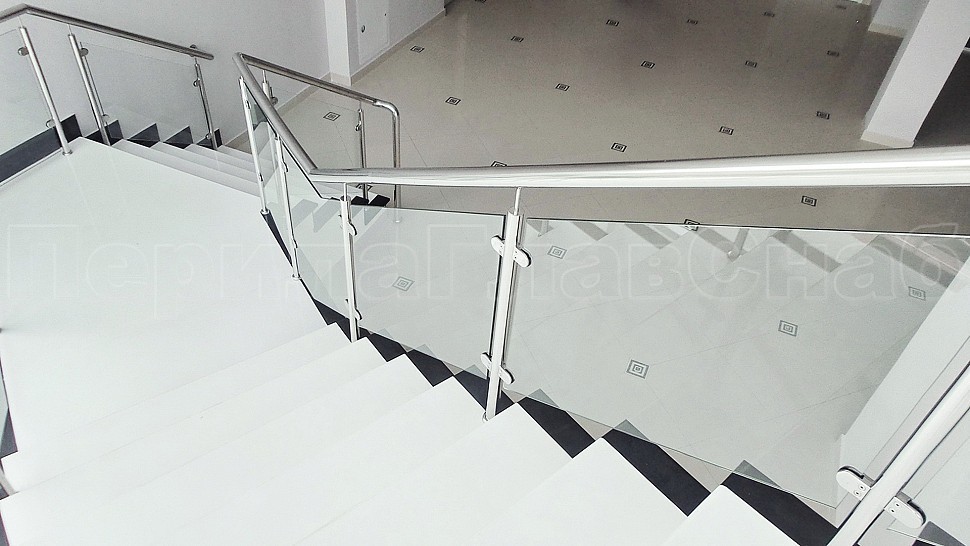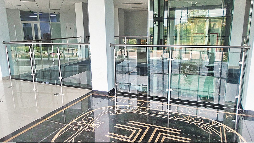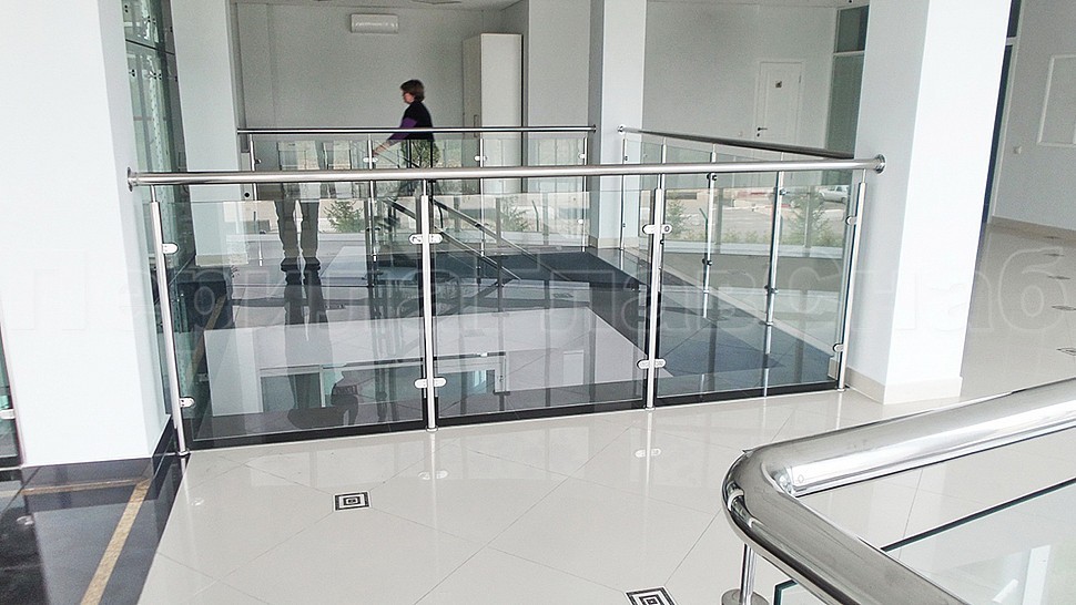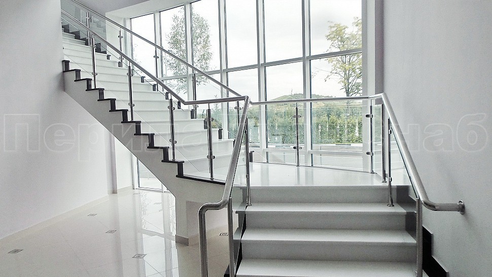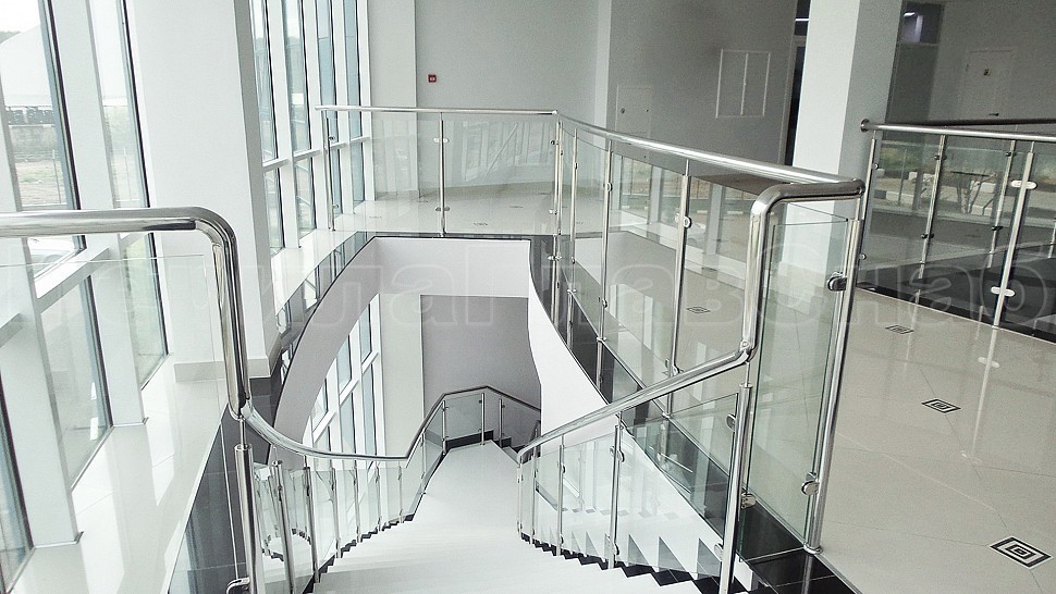 Складскому комплексу с административно-бытовыми помещениями было установлено ограждения двух внутренних центральных лестниц и атриума из полированной нержавеющей стали AISI 201 со стеклом. Высотой 950 мм и 1200 мм, стойки диаметр 38 мм, крепление сверху методом алмазного бурения диаметром 42 мм на глубину 70 мм, устанавливаются через две ступени в третью, наконечник стойки штырь, низ стойки декоративная крышка диметр 56 мм; стекло прозрачное закаленное 8 мм, крепится на зажимных стеклодержателях; поручень диметр 50,8 мм, окончание поручня заглушка. Крепление нержавеющих элементов ограждения между собой точечная аргонно-дуговая сварка, с последующей зачисткой и полировкой. г. Москва, ЗАО, внутригородское муниципальное образование Ново-Переделкино, промзона Орлово, проектируемый проезд 635.