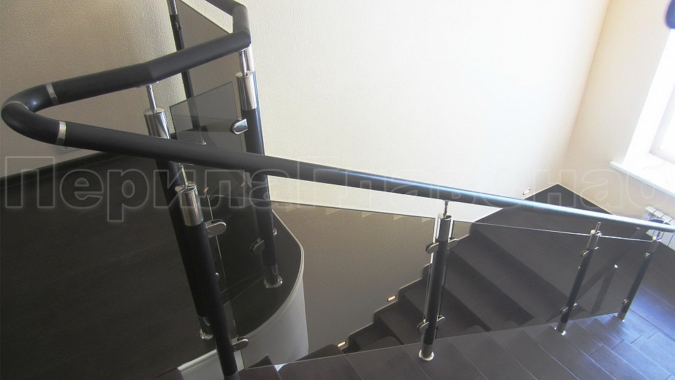 В загородный дом, было установлено лестничное ограждения высотой 950 мм с бронзовым каленым стеклом толщеной 8 мм, с деревянным поручнем диаметром 50 мм, стойки диаметром 50 мм из полированной нержавеющей стали с деревянными вставками устанавливаются через две ступени на третью. Верх стойки штырь, низ стойки декоративная крышка. Окончание поручня заглушка. Поручень завязан, свариваемые швы шлифуются и полируются до блеска. Наши лестницы и ограждения всегда найдут место в вашем доме. Впишутся в любой интерьер. Московская область, Солнечногорский район, д.Якиманское