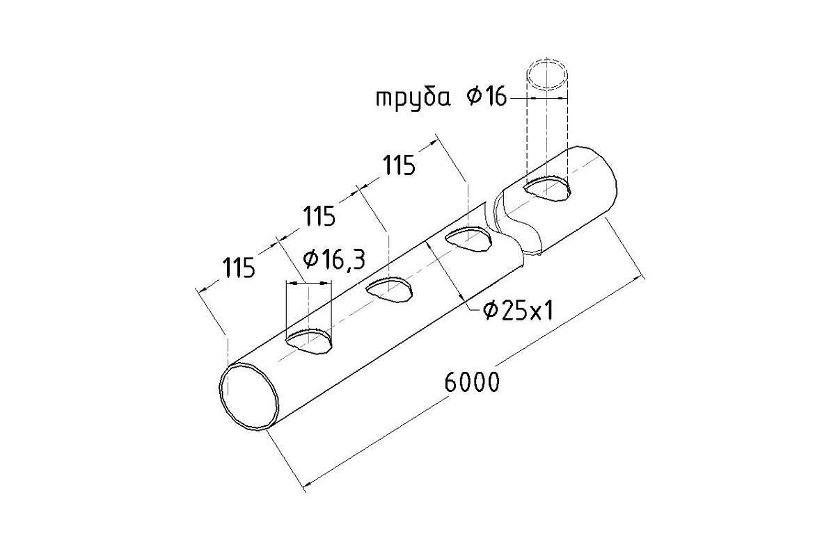 В конструкции предусмотрены круглые отверстия. Марка стали: AISI 304 — устойчива к коррозии, подходит для эксплуатации в условиях повышенной влажности. Размеры: 25 мм (наружный диаметр) × 1 мм (толщина стенки) × 6000 мм (длина). Перфорация: отверстия Ø12 мм с шагом под углом 90°. Обработка поверхности: GRIT 600 — полированная.