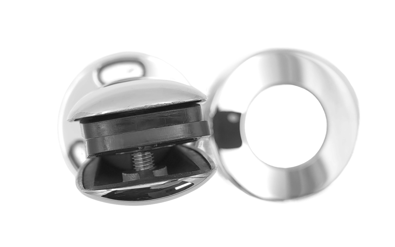 Стеклодержатель литой напольный, круглый, для стекла 12-16 мм, полированный (AISI 304). Так же вам понадобиться для крепежа потайной винт под шестигранник k601-19-120.