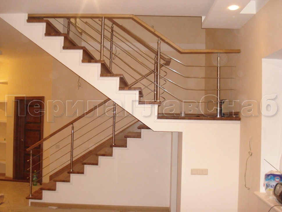 Три ригеля на сварке, квадратный деревянный поручень и круглые стойки