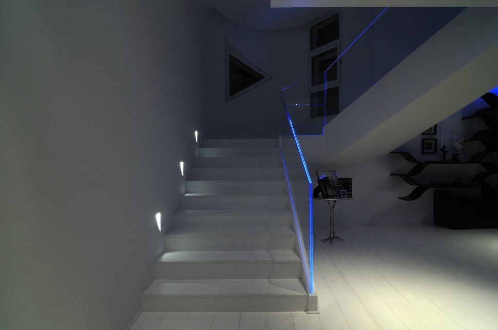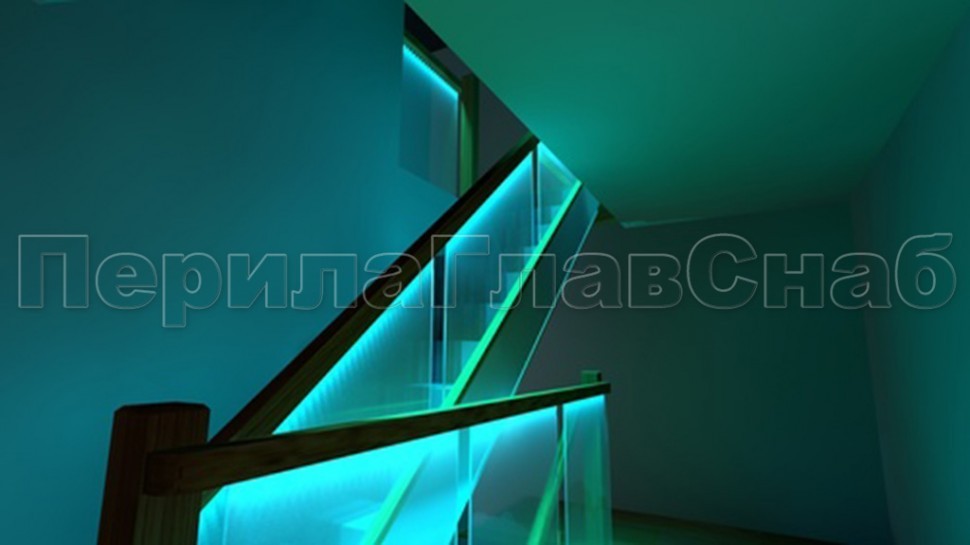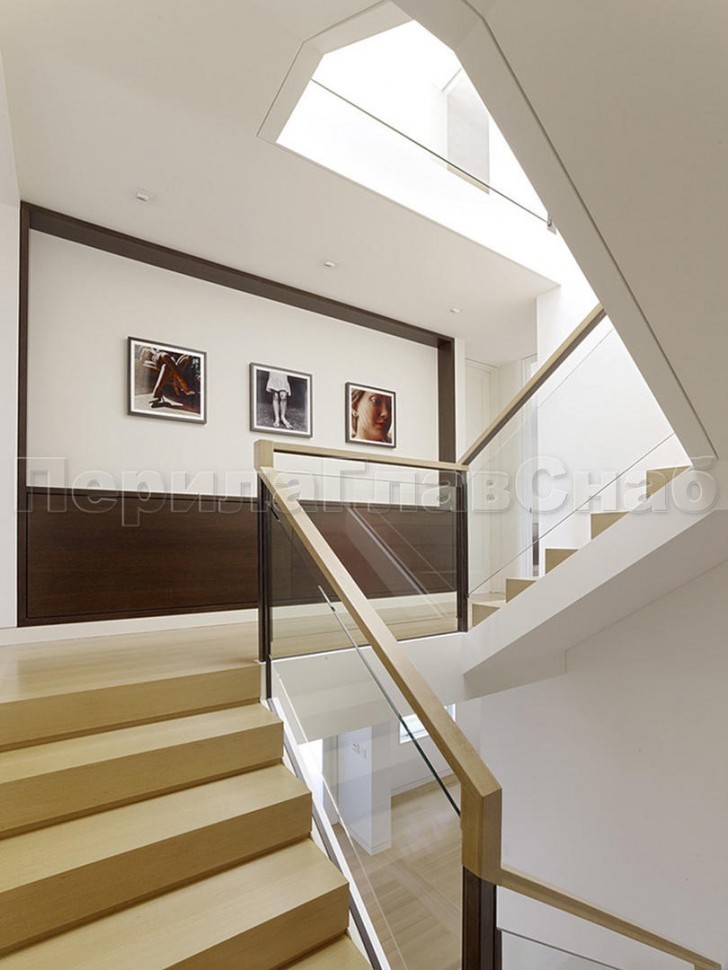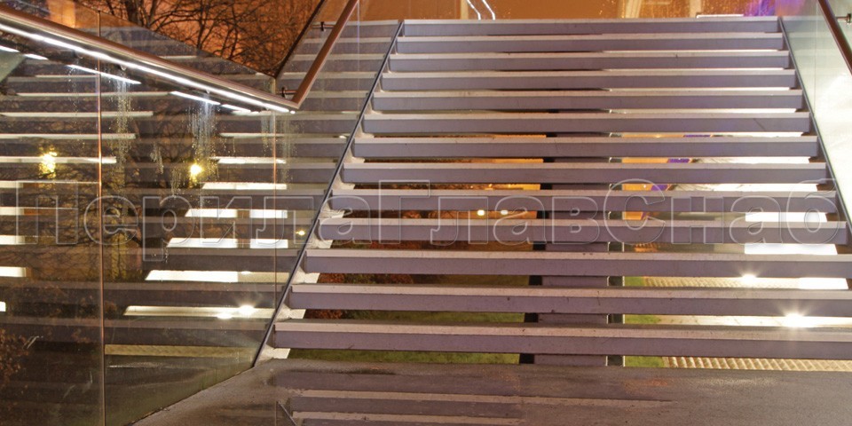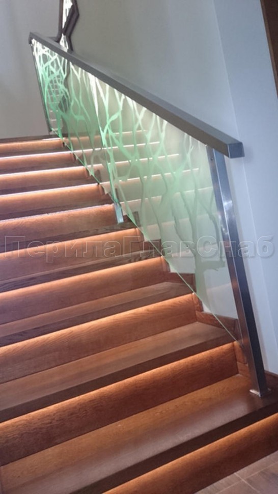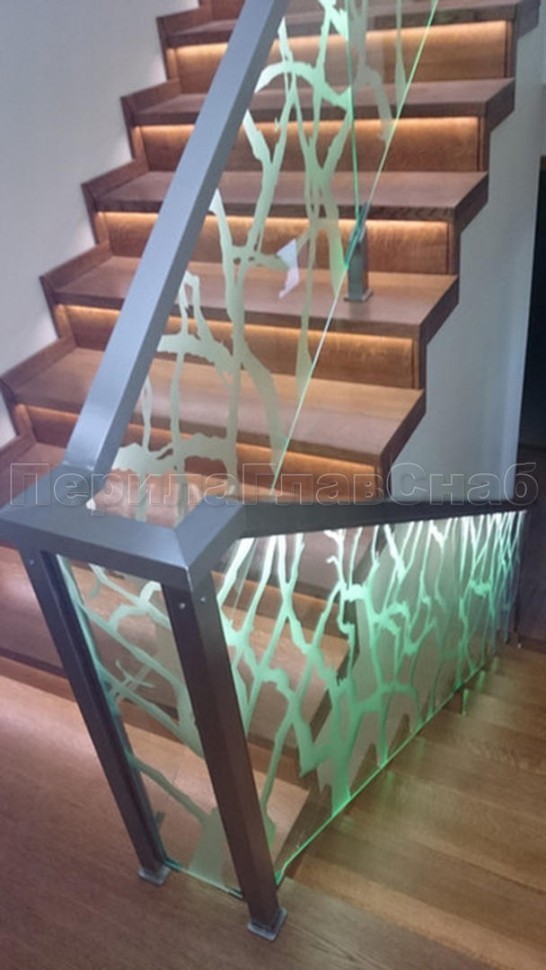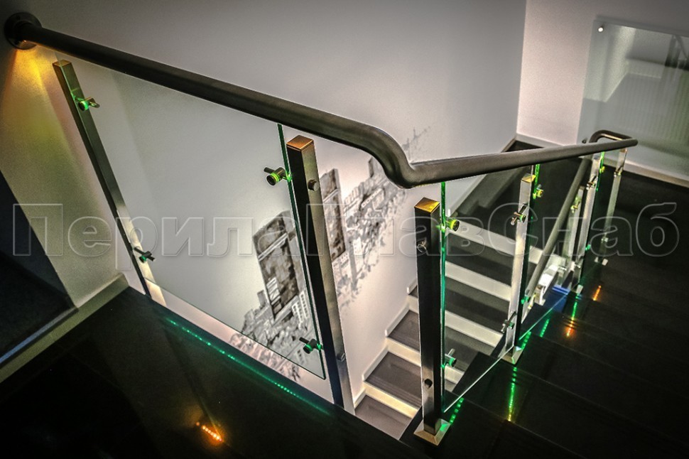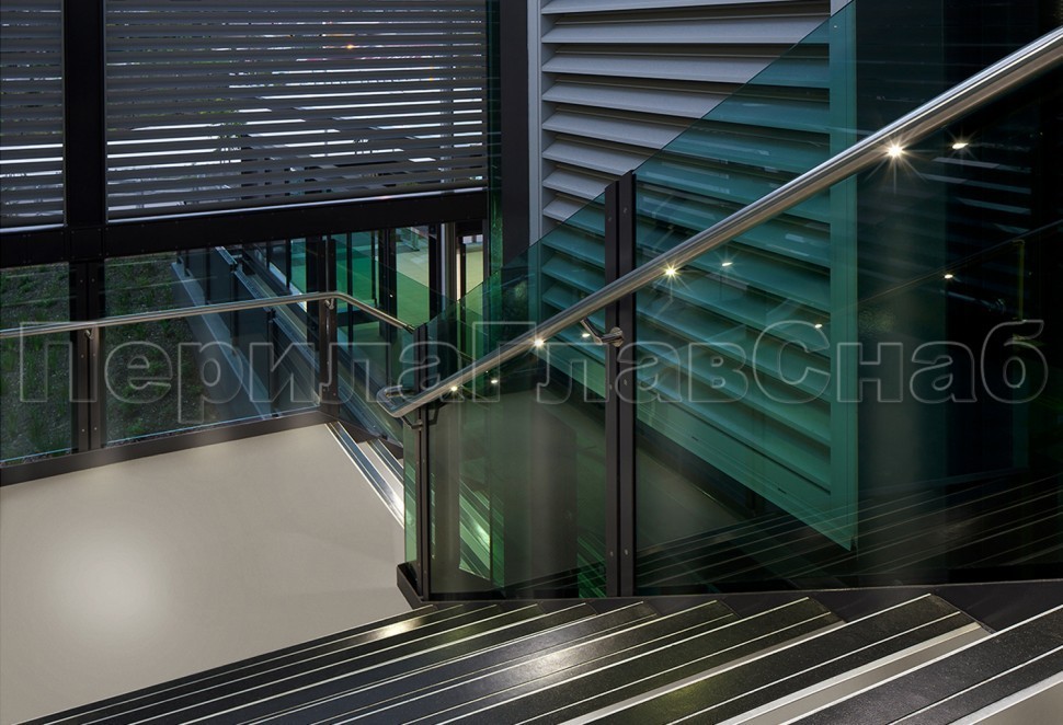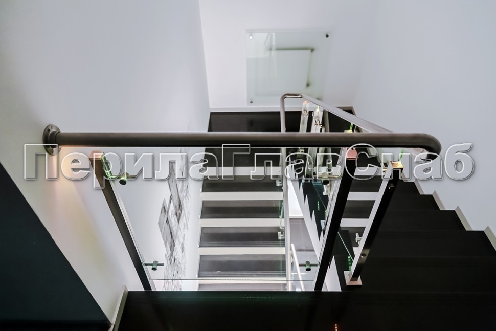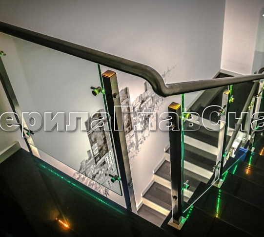 Ограждение лестницы со стеклом, тонированным в массе, стойки и завязки поручня из латуни