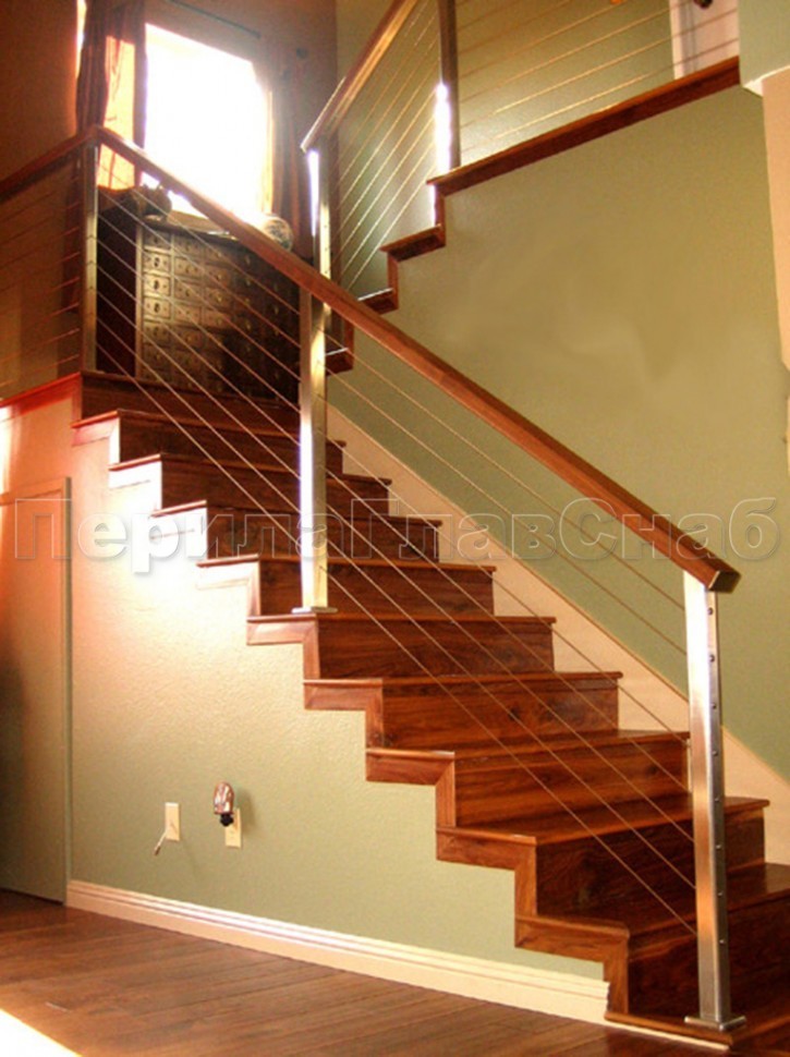 Ограждения из нержавейки. Заполнение из 4х тросиков. Квадратные стойки.