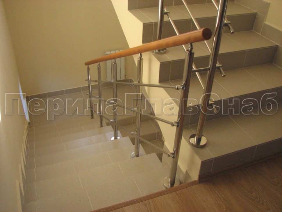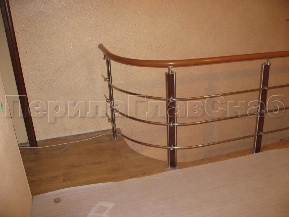 Три ригеля на сварке, квадратный деревянный поручень и круглые стойки