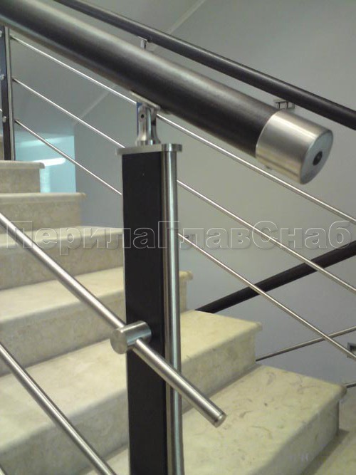 Четыре ригеля на держателях, квадратный деревянный поручень и квадратные стойки